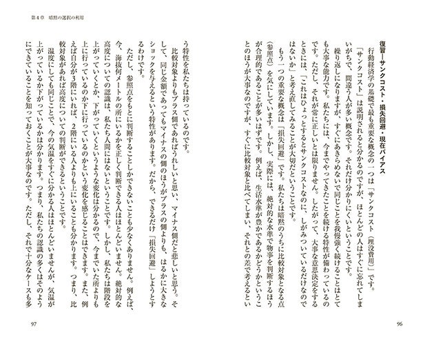 まず、序章では、私たちの直感的意思決定が合理的な意思決定からずれてしまうことの例を紹介します。続いて、第1章では、合理的意思決定からのずれが経済的な意思決定で生じやすいことをサンクコストという概念を使って紹介します。サンクコストをよく理解できれば、人生での悩みもずいぶん減ると思います。なんとか損を避けたいという気持ちも悩みをもたらす原因です。