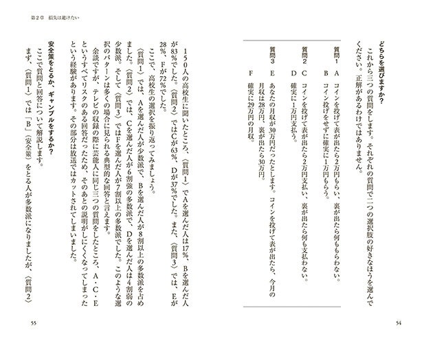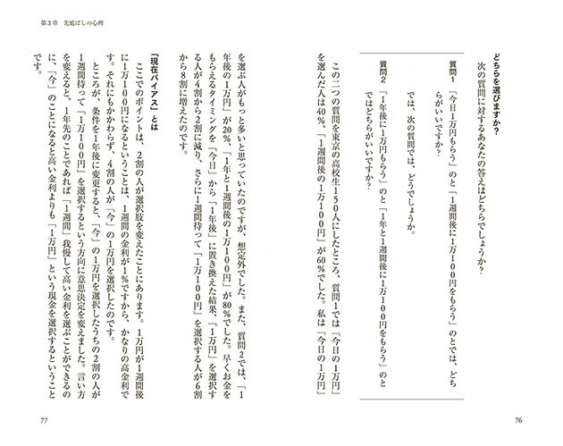 第2章では、損を避けたい気持ちがバイアスをもたらすことを説明します。人生で後悔することが多いのは、どうしてあのとき先延ばししたのかということです。先延ばしをする原因について第3章で説明します。先延ばしの対策には、積極的な意思決定をしなくてもいい状況(デフォルト)をあらかじめつくっておくことが有効です。