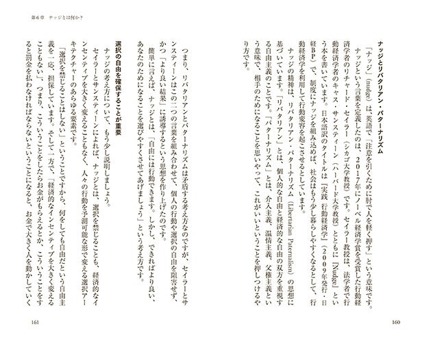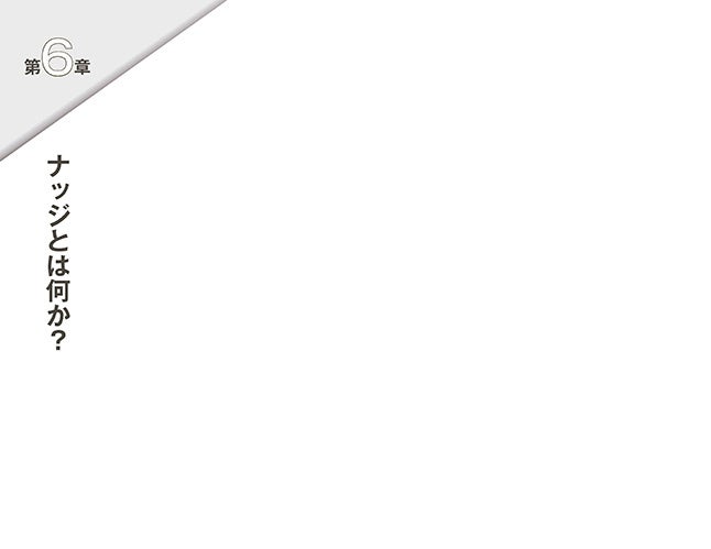 ナッジとリバタリアン・パターナリズム/選択の自由を確保することが重要/大きな金額をかけないことも重要/ナッジ」と「スラッジ」/ナッジ設計のプロセスフロー「BASIC」/ナッジのチェックリスト「EAST」/ナッジを選ぶ際のポイント/ボトルネックを引き起こす行動経済学的特性/行動のボトルネックの特性と対策/ダイエットはなぜ難しいのか/ダイエットのナッジ/社会規範と分かりやすさを使った残業削減ナッジ/ナッジに対する批判/デフォルトを用いた行政の取り組み例/男性職員の育児休業取得を増やす/後発薬を増やして医療費を下げた/人との接触を8割減らす10のポイント/「ナッジ」から見た三つの見出し/手指消毒のナッジ/はみ出し喫煙のナッジ