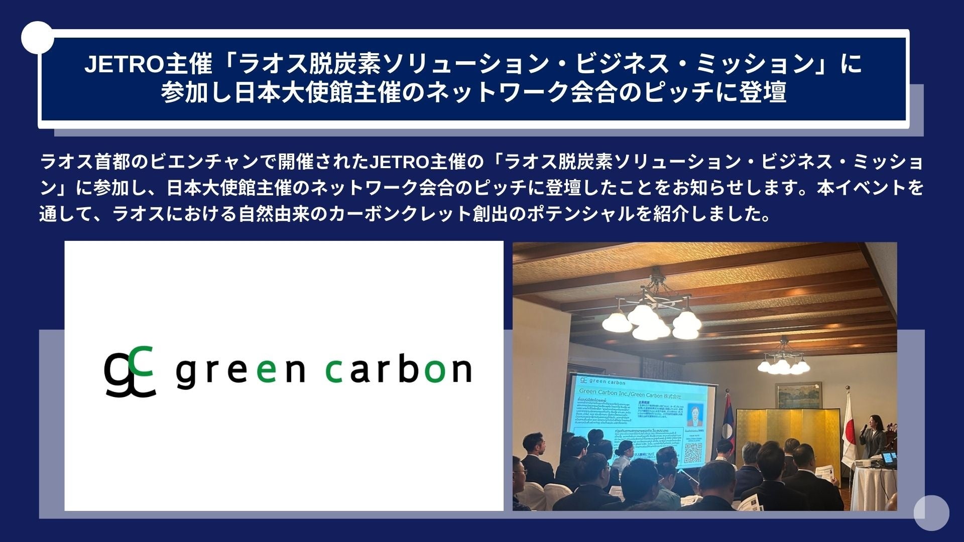Green Carbon株式会社(代表取締役:大北潤、以下Green Carbon(読み:グリーンカーボン))はラオス首都のビエンチャンで開催されたJETRO主催の「ラオス脱炭素ソリューション・ビジネス・ミッション(以下、本イベント)」に参加し、日本大使館主催のネットワーク会合のピッチに登壇したことをお知らせします。本イベントを通して、ラオスにおける自然由来のカーボンクレット創出のポテンシャルを紹介しました。