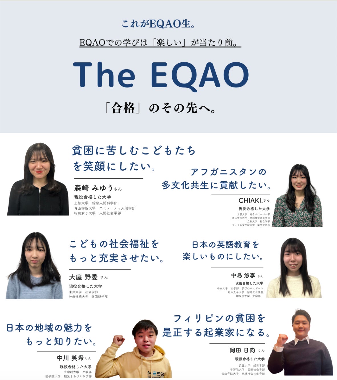また、「EQAO」という名称には、IQではなくEQを育むことを目指しているという理念が込められています。EQを伸ばすための最適なプロセスとして総合型選抜を活用するというコンセプトから名付けられ、読み方を「エカオ」とすることで「笑顔」をイメージさせ、親しみやすさと明るい未来を象徴しています。
