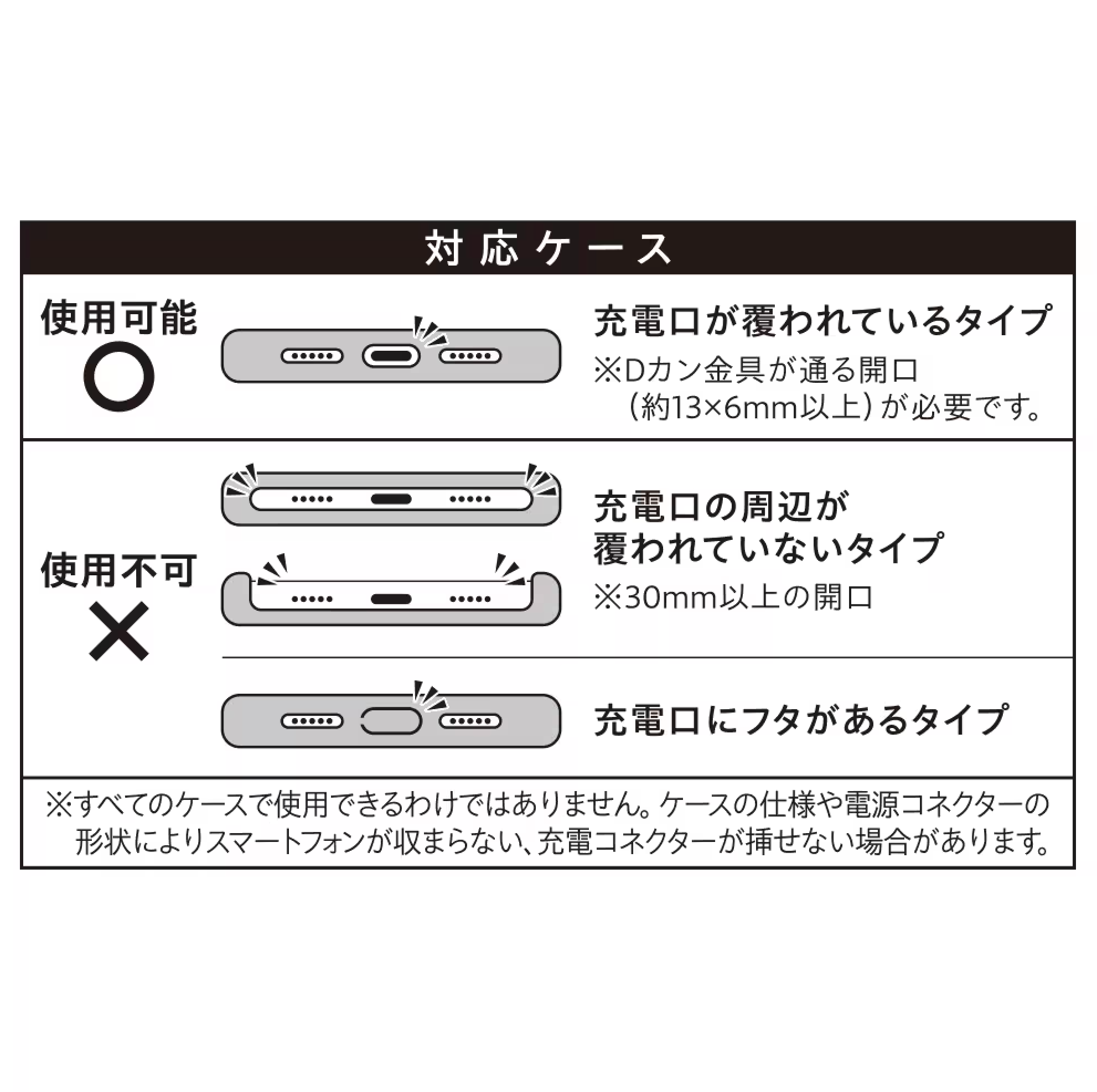 ■使用可能なケース:充電口の周辺が覆われているタイプ ※Dカン金具が通る開口(約13×6mm以上)が必要。