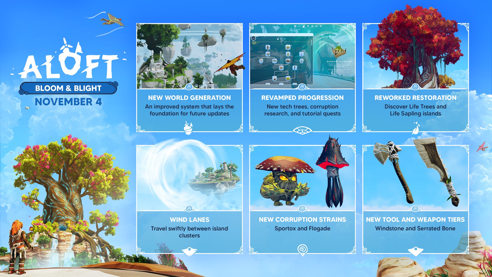 本日、デベロッパーの Astrolabe® Interactive とパブリッシャーの Funcom は、浮遊する島々を舞台とする協力プレイのサンドボックスサバイバルゲーム『Aloft』の大型アップデート「Bloom & Blight (ブルーム&ブライト)」を11月4日(火)に配信開始予定であることを発表しました。