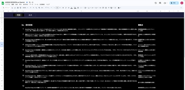 「AIQQQ SESSION on Gemini」では、GeminiのAPIを組み込んで、本セッション用に独自開発したGoogle Workspaceのスプレッドシート※2を活用し、YouTube動画広告の企画をスプレッドシート上に自動的に出力したり、商品特性・ターゲット特性などを一覧化したりできます。スプレッドシートには、電通の戦略プランナーが長年培ってきたさまざまなフレームワークやクリエイターの企画方法を反映させたプロンプトを実装しているほか、国内電通グループ(dentsu Japan)のクリエイターの企画ノウハウを豊富に学習させているため、品質の高い企画案の出力が可能です。また、dentsu Japanが保有する独自の生活者データとの連携により、生活者を模したAIペルソナ(顧客像)にチャットを通じてインタビューを行うこともできます。電通デジタルのAIを活用したマーケティングソリューションブランド「∞AI®(ムゲンエーアイ)」※3とも連携する予定です。