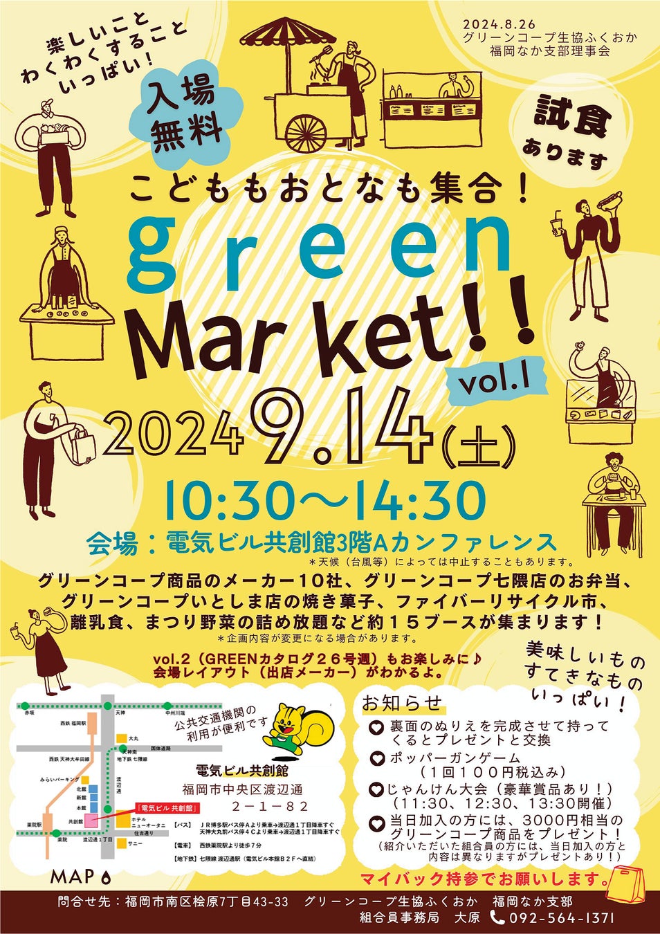 会場には九州を中心に10社のメーカーや生産者が一堂に集まり、8月に登場したグリーンコープの離乳食や人気商品の肉まんや餃子などを試食しながら、普段お会いできないメーカーや生産者と交流することができます。さらに、当日はグリーンコープのマスコットキャラクター元気くんもイベントに参加し、こどもからおとなまで楽しんでいただけるよう「野菜の詰め放題」や「ポッパーガンのシューティングゲーム」、「じゃんけん大会」を実施します。