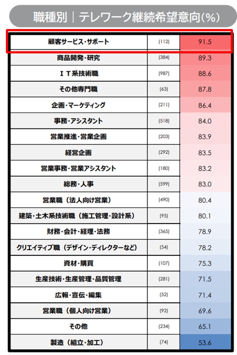 株式会社リンクが実施したワークスタイルに関する意識調査※2によると「週2日以上の在宅勤務」の割合が64.7%で、2023年度より12.5ポイント減少し、在宅勤務を廃止・縮小する「出社回帰」を推し進める企業も増えているとされています。一方で、パーソル総合研究所の業種別テレワーク継続意向調査※3にて「顧客サービス・サポート」が1位を獲得するなどコンタクトセンター業界の就業者にとっては在宅ではたらき続けることを求めている結果が出ています。
