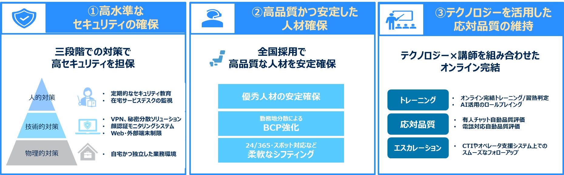 今回提供する「センターレス・サポート」では、これまで行ってきた在宅型コンタクトセンターサービスに加えて、「高水準のセキュリティ確保」「高品質かつ安定した人材確保」「テクノロジーを活用した応対品質の維持」が可能になります。サポートセンター国際認定(七つ星)※4日本初のKCSアワード認定※5と実績のある、国際基準に基づいたコンタクトセンター運営を在宅環境で提供いたします。
