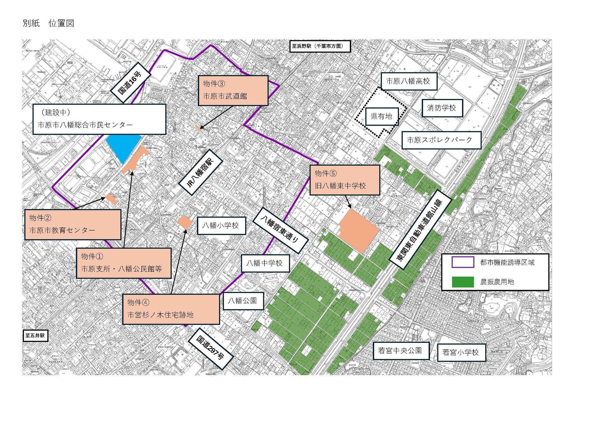 位置図の物件①~⑤、都市機能誘導区域、その周辺地域の土地