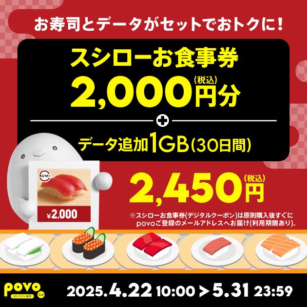 povo、「スシローお食事券」がセットのデータトッピングを5月31日まで提供