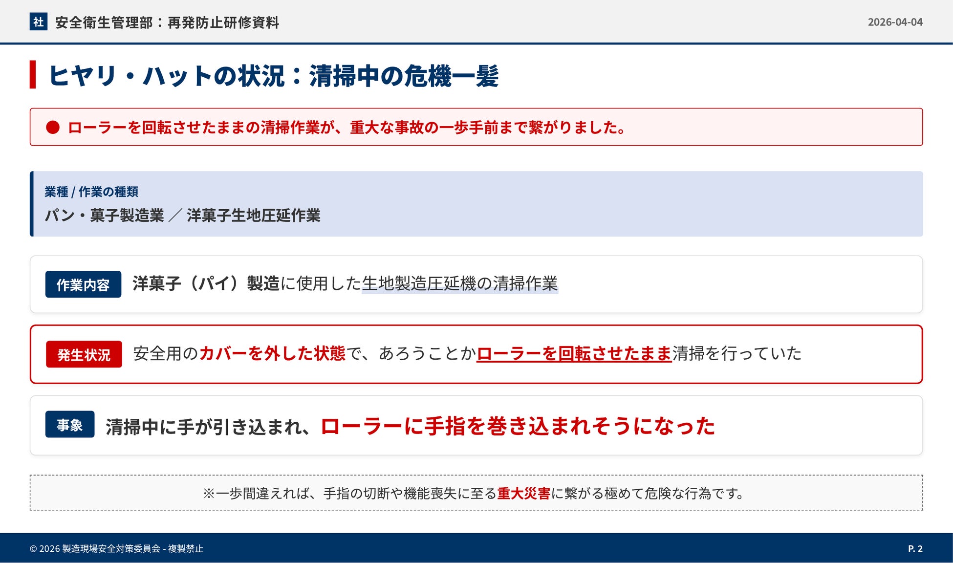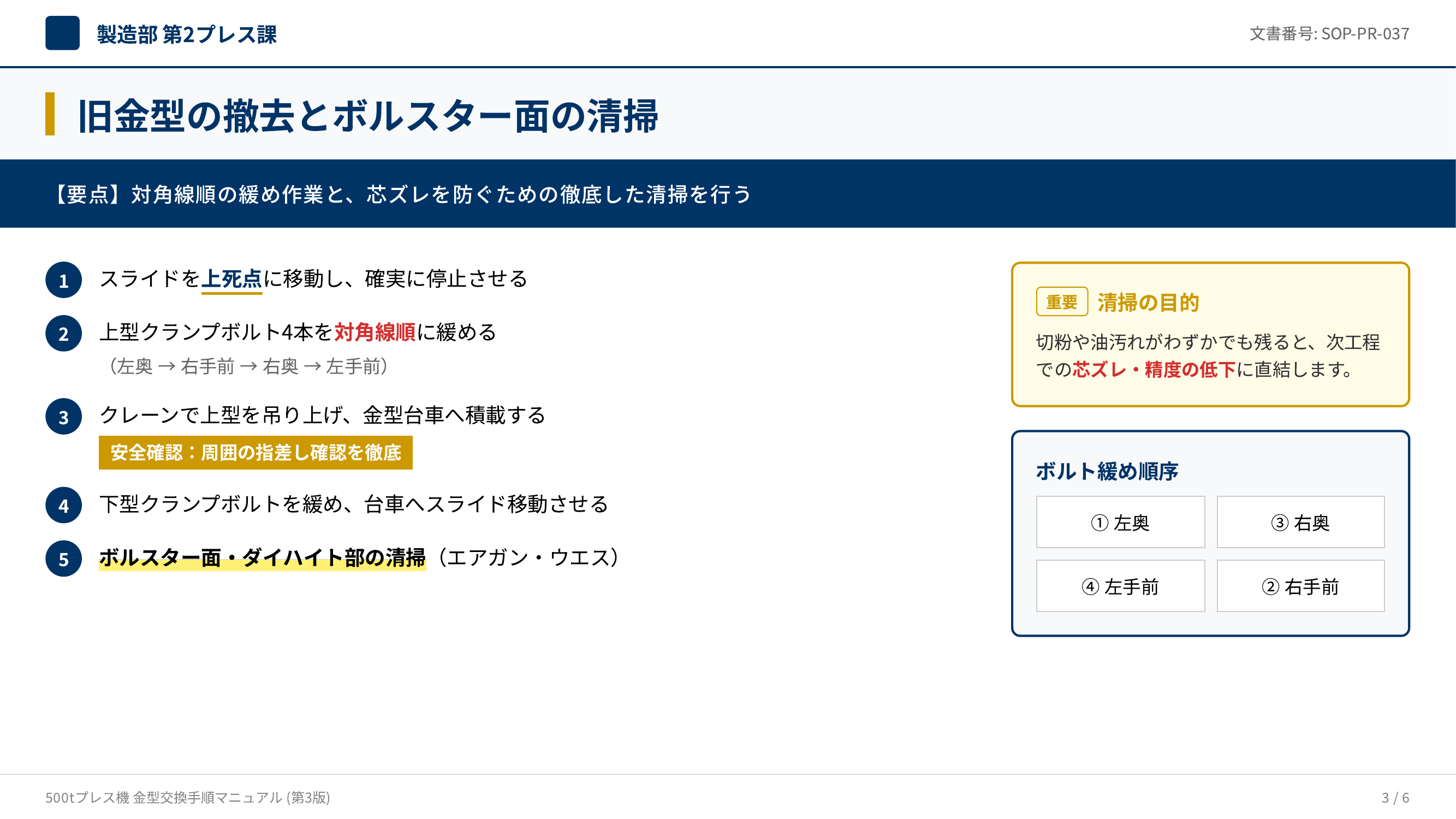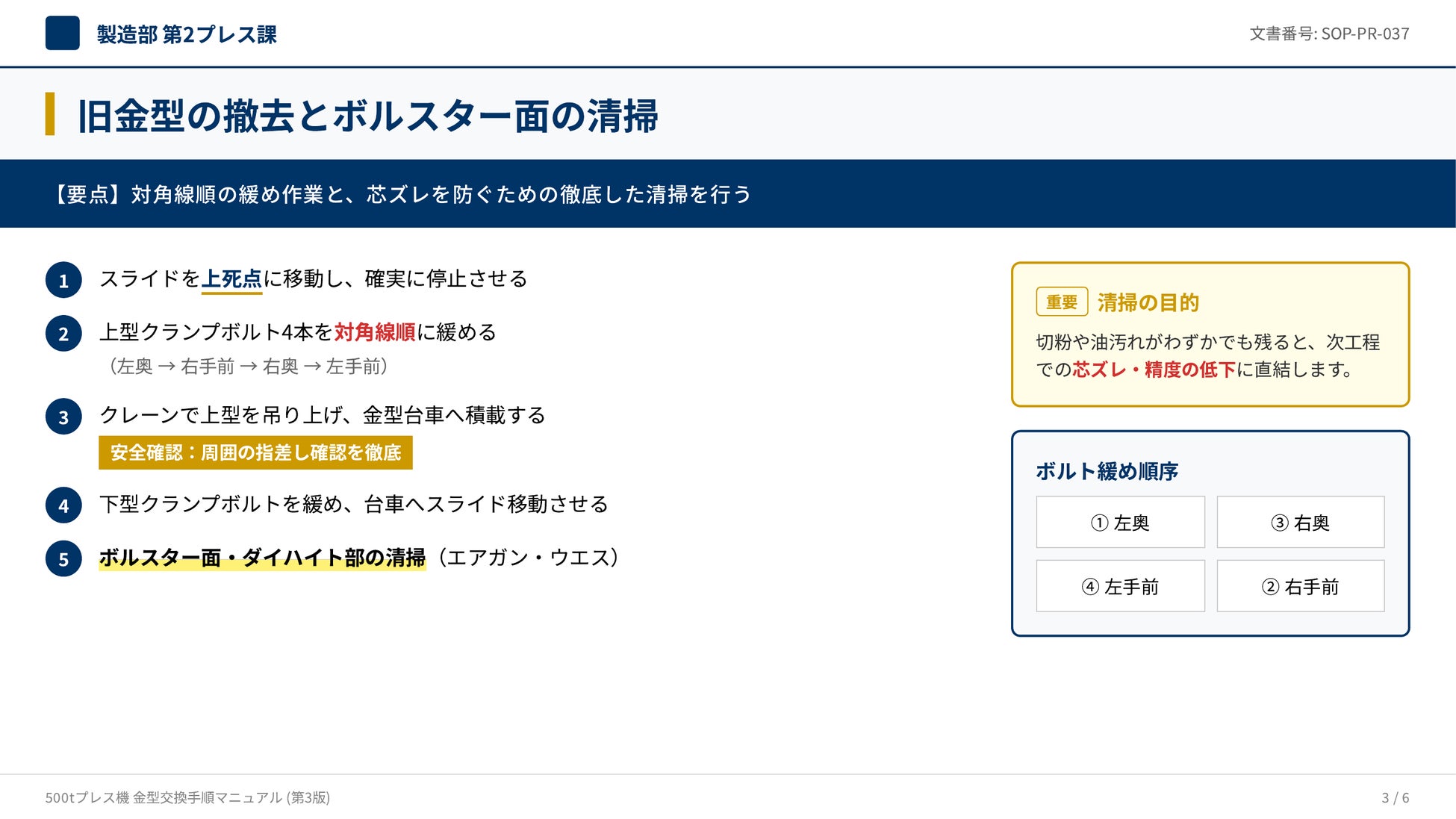 今回追加した製造業向けサンプルスライドの中から、代表的な5つの活用例を紹介します。いずれも、製造現場で頻繁に発生するマニュアル整備・研修・安全教育のニーズに対応しています。