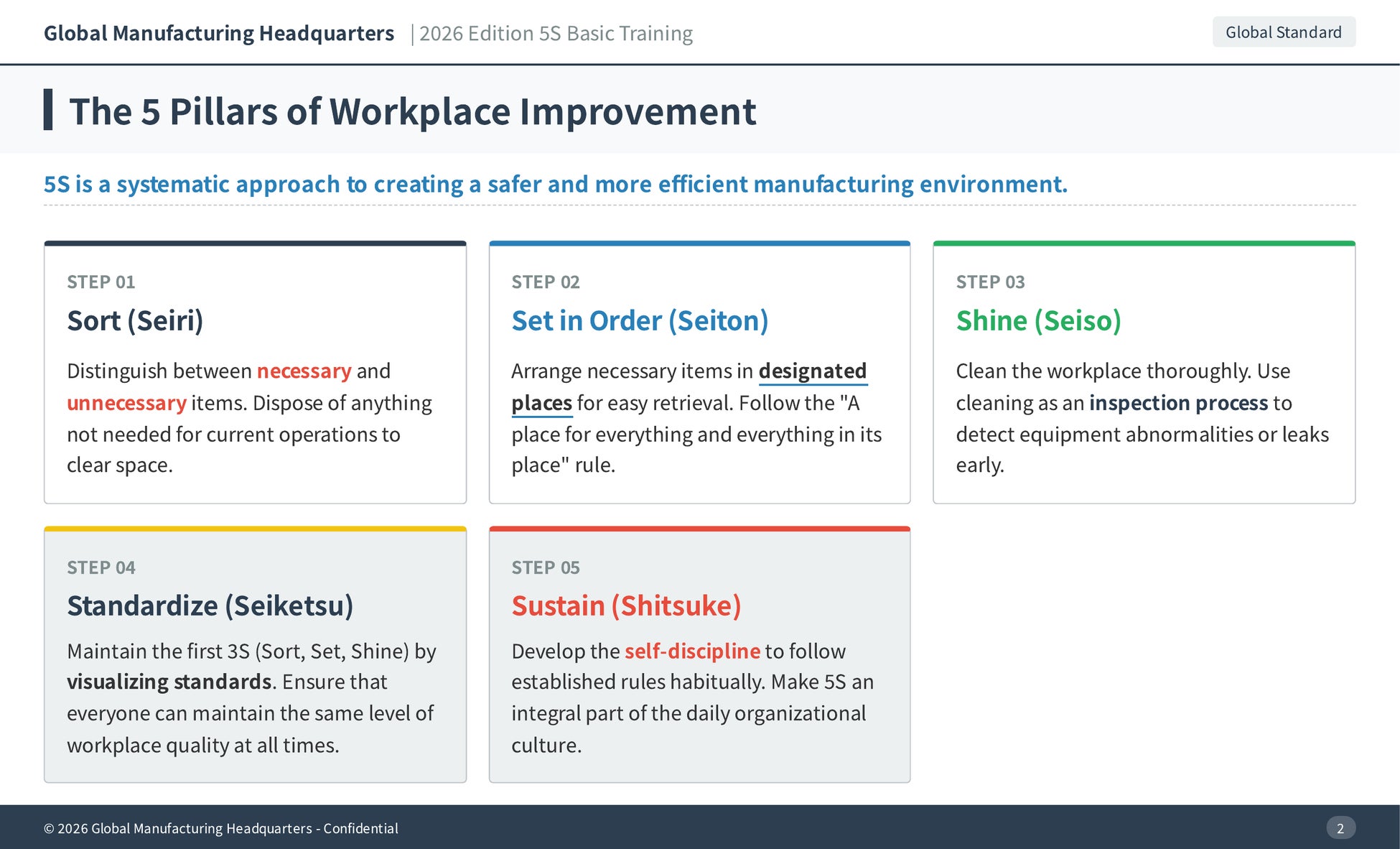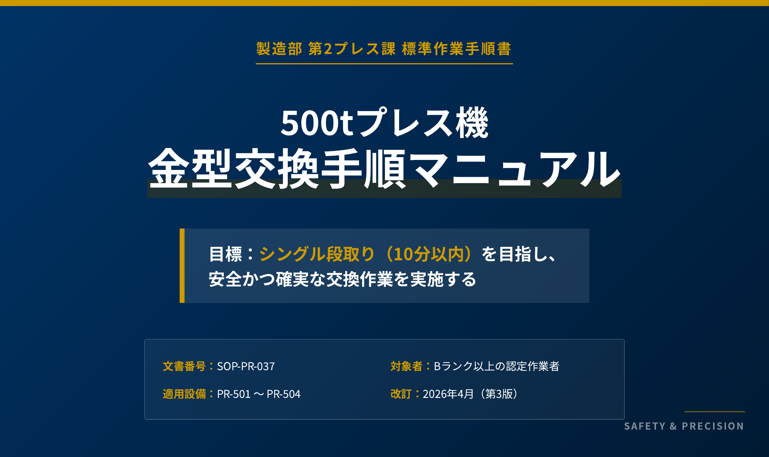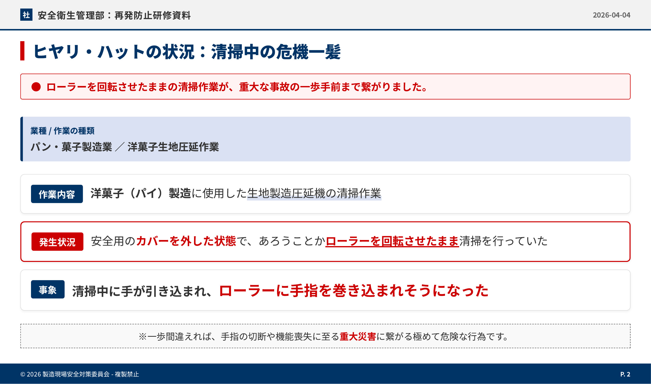 今回追加した製造業向けサンプルスライドの中から、代表的な5つの活用例を紹介します。いずれも、製造現場で頻繁に発生するマニュアル整備・研修・安全教育のニーズに対応しています。