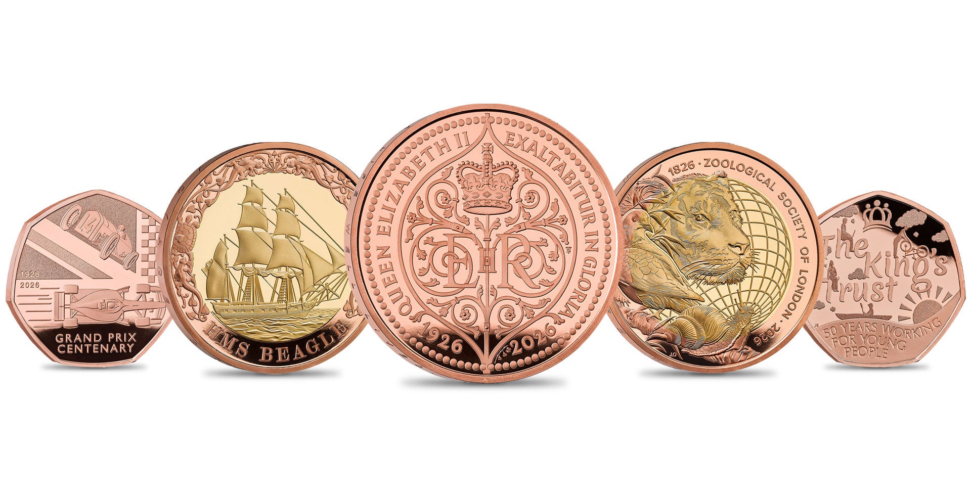 2026年の記念セットには、英国史において文化的意義の大きい人物・出来事・機関の節目を祝う5種類の記念コインが収録されています。今年は非常に興味深いテーマが揃っておりますが、その筆頭は、エリザベス2世生誕100周年記念です。