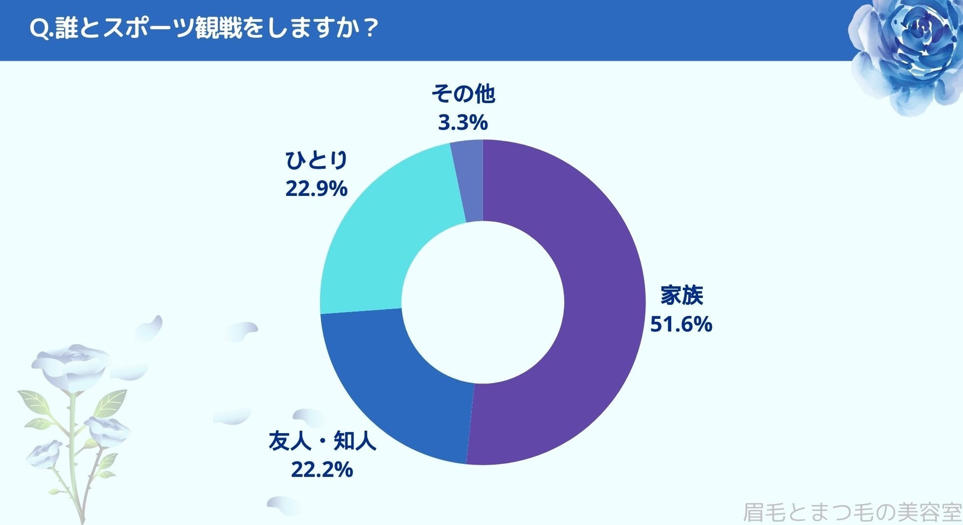 誰とスポーツ観戦をするかお聞きしたところ「家族(51.6%)」、「友人・知人(22.2%)」、「ひとり(22.9%)」、「その他(3.3%)」という結果になりました。