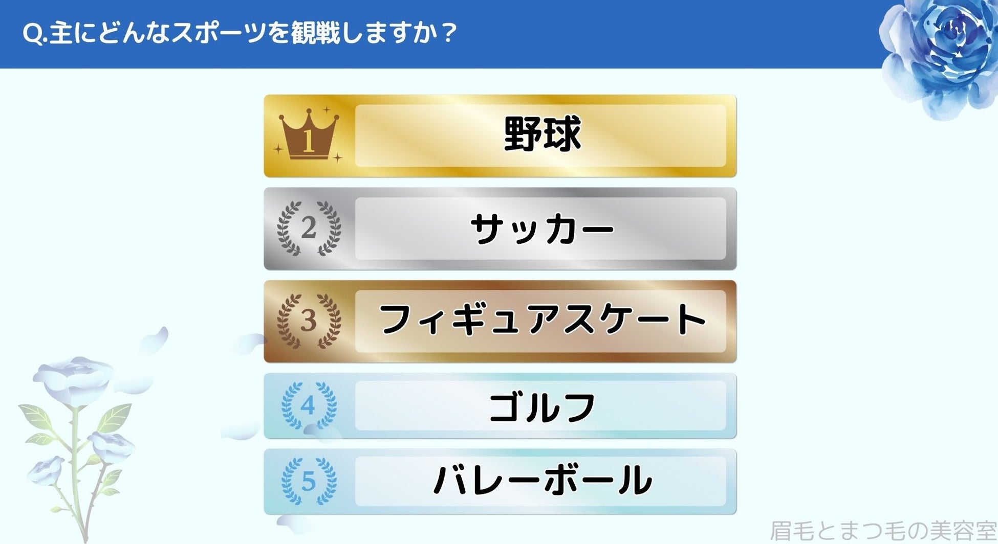 主にどんなスポーツを観戦しているかお聞きしたところ「1位>野球」、「2位>サッカー」、「3位>フィギュアスケート」、「4位>ゴルフ」、「5位>バレーボール」という結果になりました。