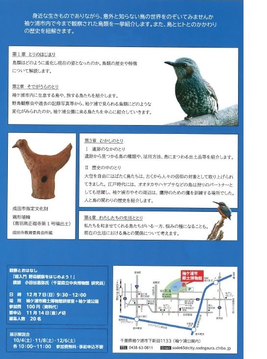 今回の企画展は、これまで行われた鳥類の調査成果をもとに、袖ケ浦市内で観察できる鳥やその変化を紹介していきます。また、鳥とヒトとのかかわりの歴史とこれからを考えます。