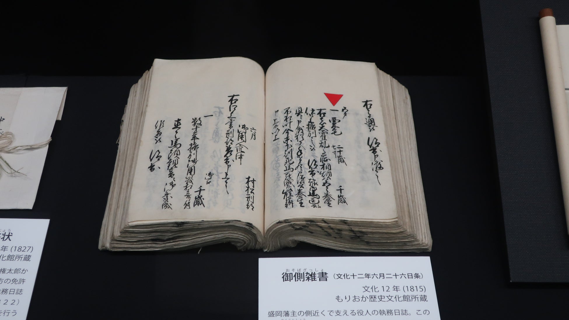 盛岡藩主の側近くで勤務する役人の執務日誌。この日、霍乱症(急性腸カタル)で亡くなった11代藩主 南部利敬の愛馬「千歳」を桜馬場の馬頭観音脇にお堂を建て祀るように命令が出された。千歳は20歳になる五戸産の栗毛の馬で、大変気に入っていた利敬は江戸参勤には必ず引き連れ、特に幕府の浅草御蔵の警備の際はこの馬にのみ乗って行っていたという。利敬の馬に対する深い愛情が感じられる逸話である。