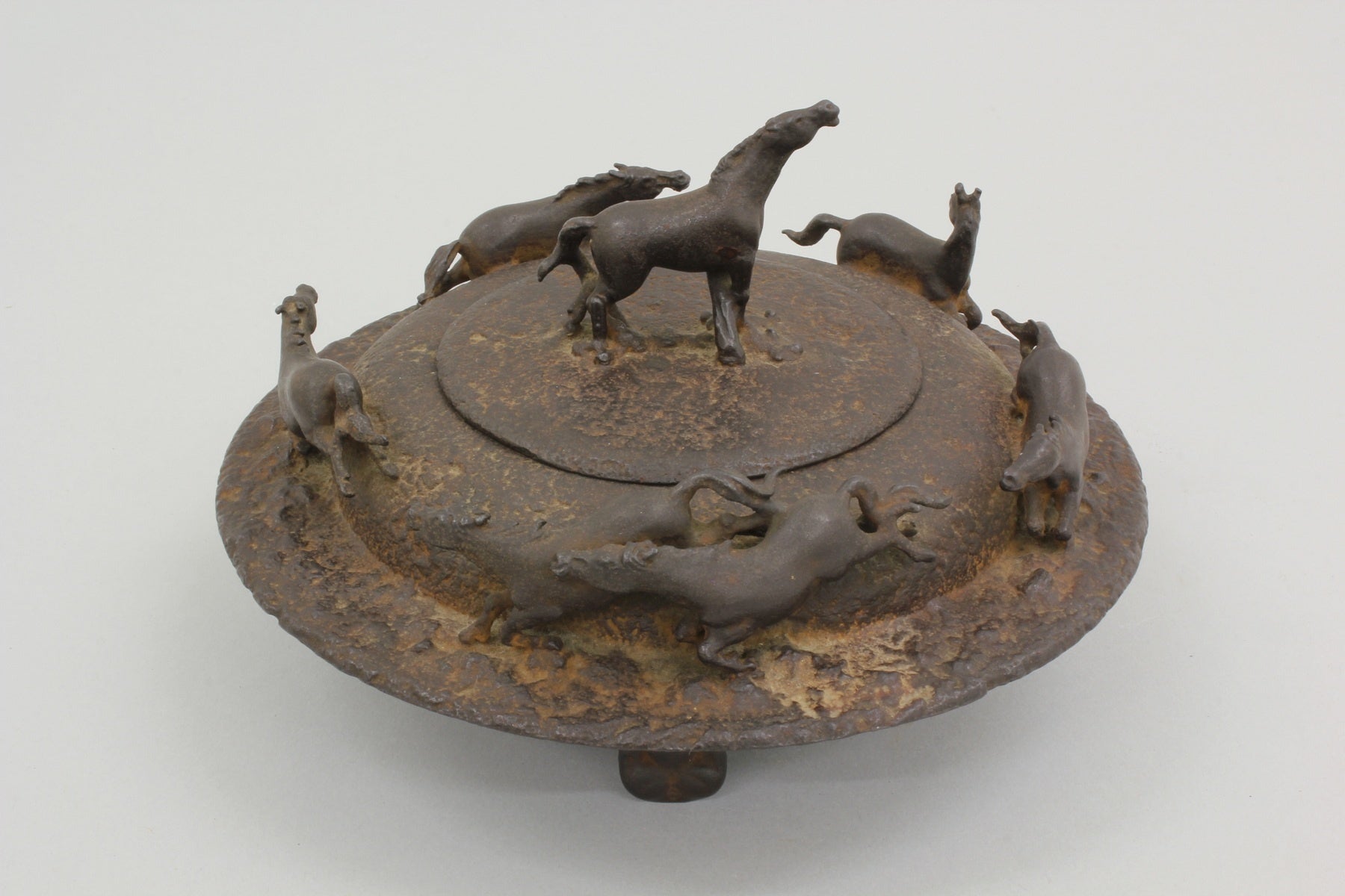 蓋の摘みにはいななく馬と、周囲には一繋ぎになり駆け巡る馬が配され、躍動感にあふれた馬の表現が見事な作品である。