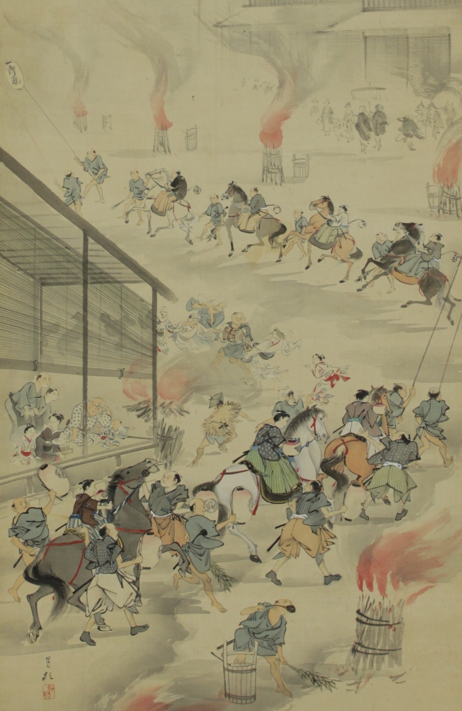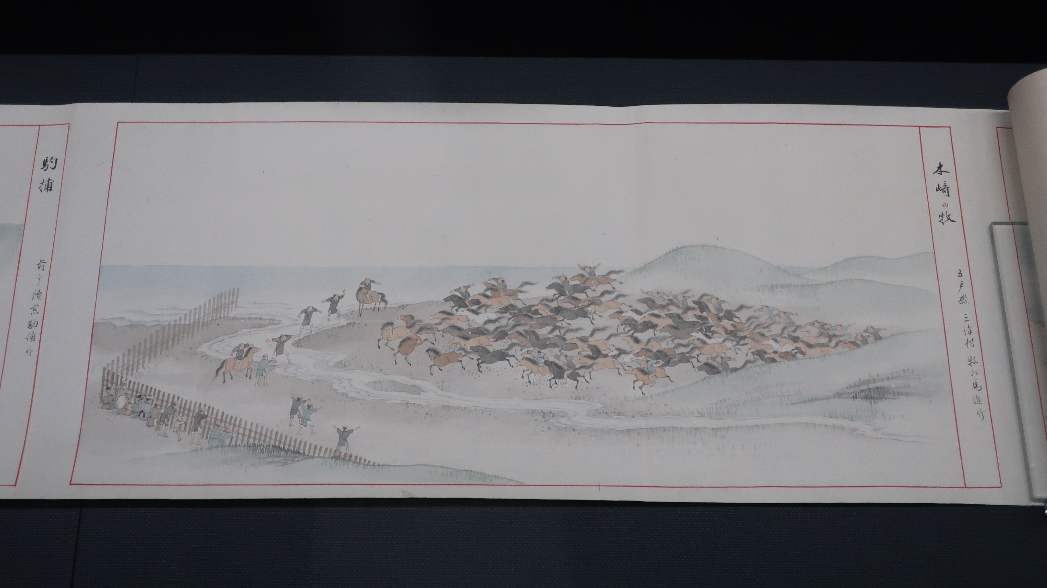 安政3年(1856)に15代藩主 南部利剛が盛岡藩北部の海岸を視察した際、巡見地の名所15ヶ所を随行した盛岡藩士 中村伊代治に描かせたもの。そのうち、利剛自身も木崎野で見学した、馬を追い込んで捕獲する「二歳駒野取」の様子も描かれる。野取を見物する人々が描かれていることから、「野取」という馬産業特有の行事が盛岡藩の風物詩となっていたことが窺われる。