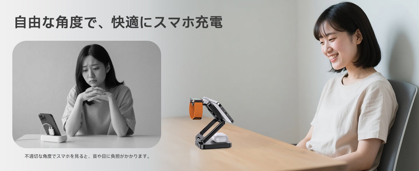 外出でもデスクでも、1台で iPhone・Apple Watch・AirPods をケーブル不要で同時充電できる新時代モデルです。