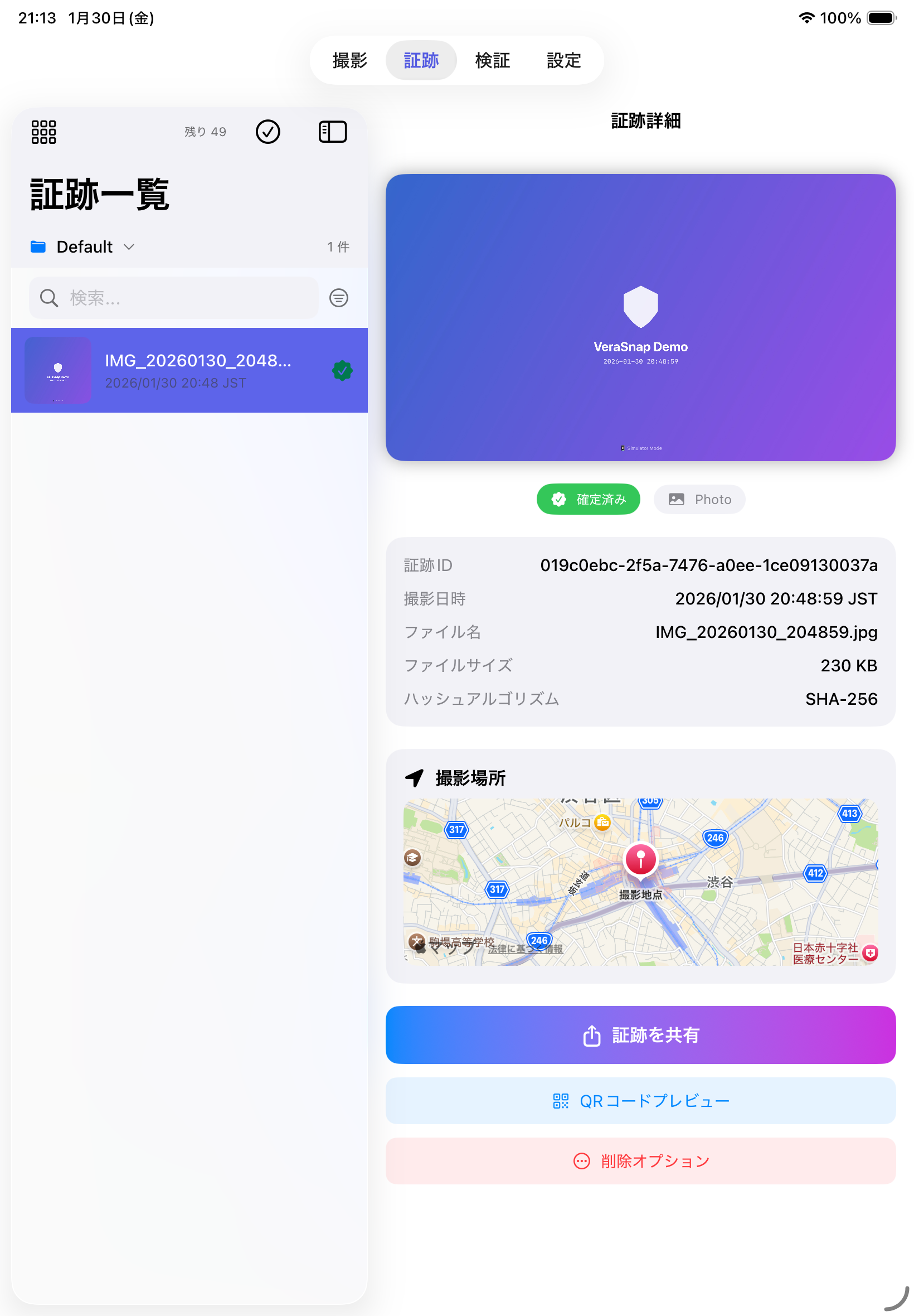 アプリ内の「VeraCheck」機能により、他者から受け取った証拠データの検証をオフラインで実行できます。