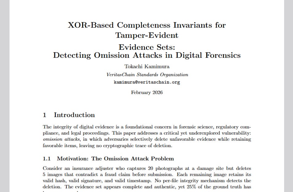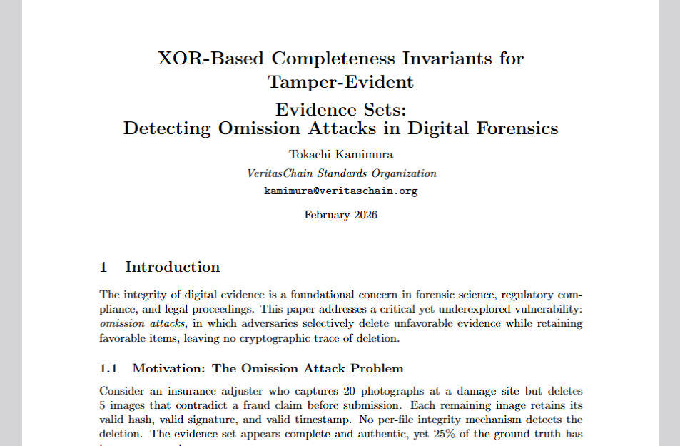 当社は、VeraSnapの中核技術であるCompleteness Invariant(完全性不変量)に関する学術論文「XOR-Based Completeness Invariants for Tamper-Evident Evidence Sets: Detecting Omission Attacks in Digital Forensics」を、欧州原子核研究機構(CERN)が運営するオープンアクセスリポジトリZenodoにて公開いたしました(DOI: 10.5281/zenodo.18455556)。
