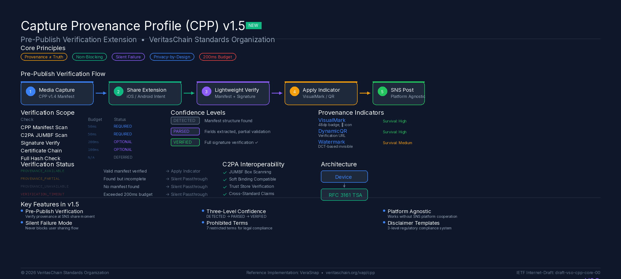 VeritasChain Standards Organization(VSO)は、デジタルコンテンツの撮影証跡を暗号学的に証明するオープン仕様「Capture Provenance Profile(CPP)」のバージョン1.5を2026年1月30日に公開しました。