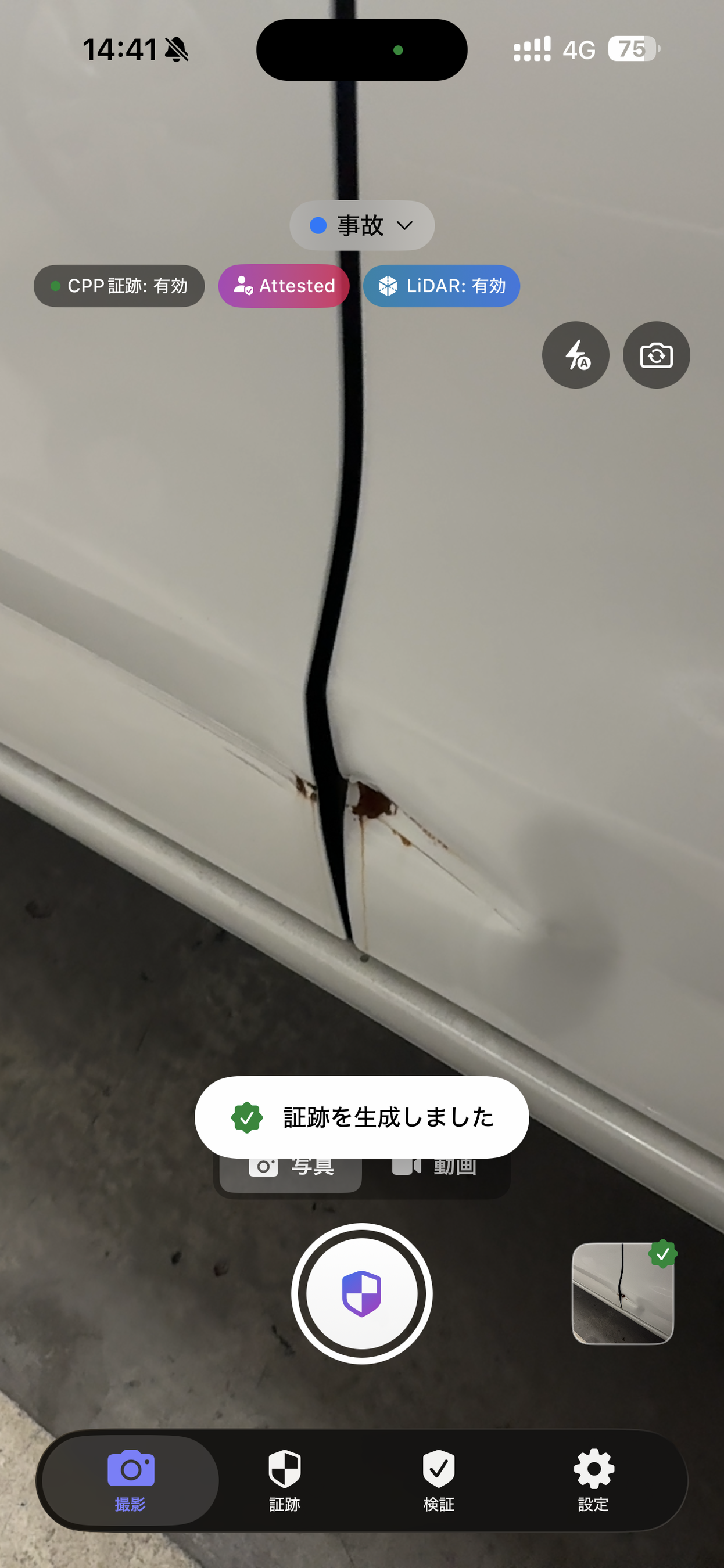 これにより、保険金請求における写真詐欺の防止、法的証拠としての信頼性向上、リモート検査での不正防止が可能になります。生の深度データは保存せずハッシュ値のみを記録するプライバシー保護設計も特徴です。