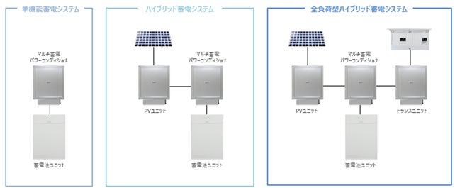 ※1:マルチ蓄電プラットフォーム:マルチ蓄電パワーコンディショナ「KPBP-A」を中心に、機器の組合せにより、単機能型・ハイブリッド型・全負荷バックアップ型と、住環境にあわせて最適な蓄電システムを選べる多様な蓄電システム