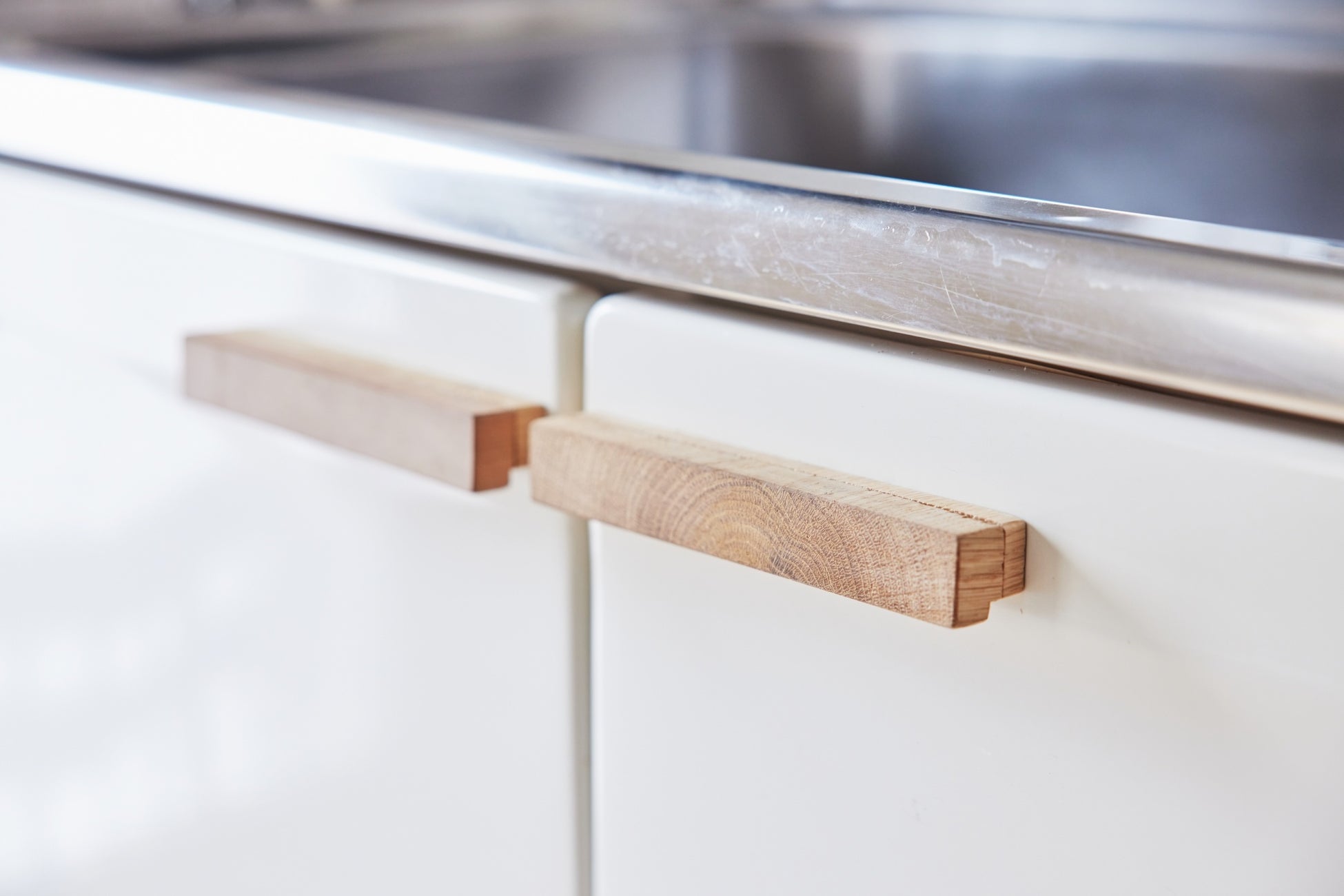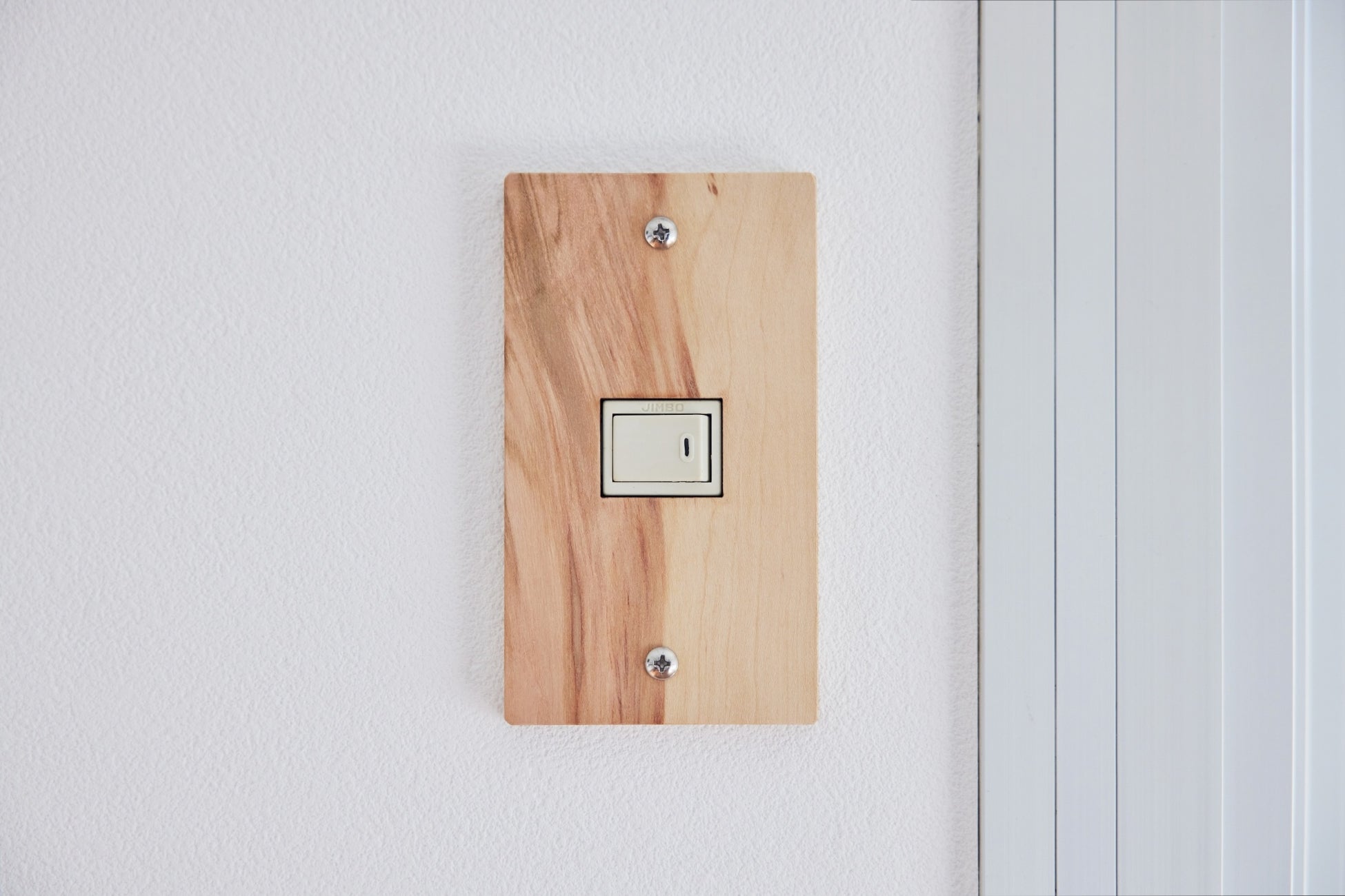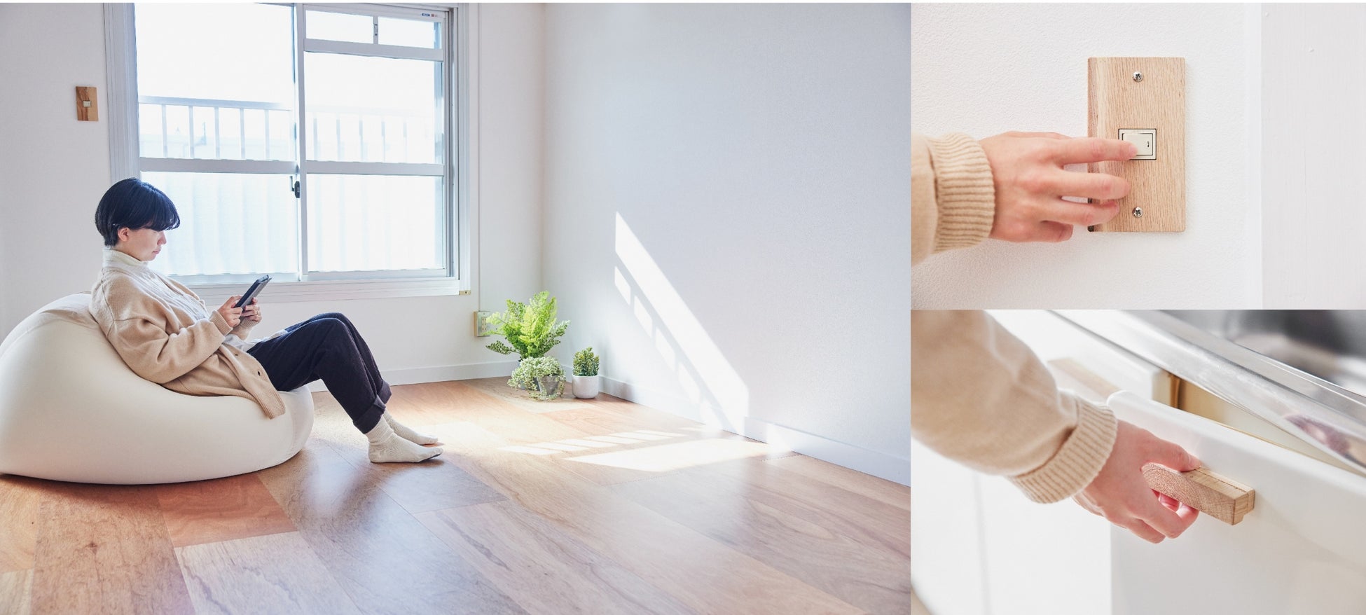 合板フローリングと、木製の取手スイッチプレートを組み合わせることで木のあたたかみを感じることができます。様々なタイプのキッチンに取り付けることができる木製取手と、壁の要所に取り付けられる木製スイッチプレートは、小さいながらも存在感を主張し、暮らしを彩るアクセントになります。