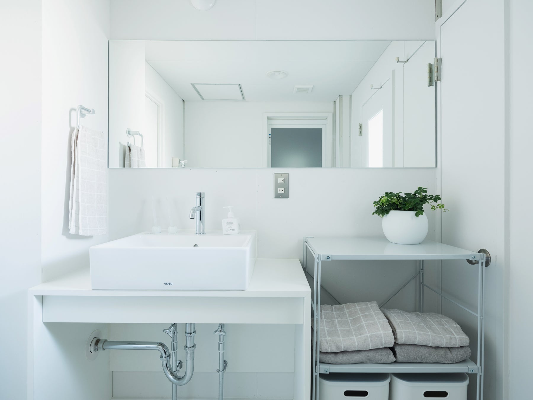オリジナルのキッチン・ユニットバスのいずれかのパーツか、洗面台にアルミアクセサリーを組み合わせて採用することで、気持ち良い水回りを実現しました。シンプルで無駄を省いた作りのキッチンと洗面台は、備え付けの収納が無いため、好きなように収納をカスタムすることができます。目にも手にも触れるアクセサリーは、いつまでも飽きのこないスタンダードなデザインです。