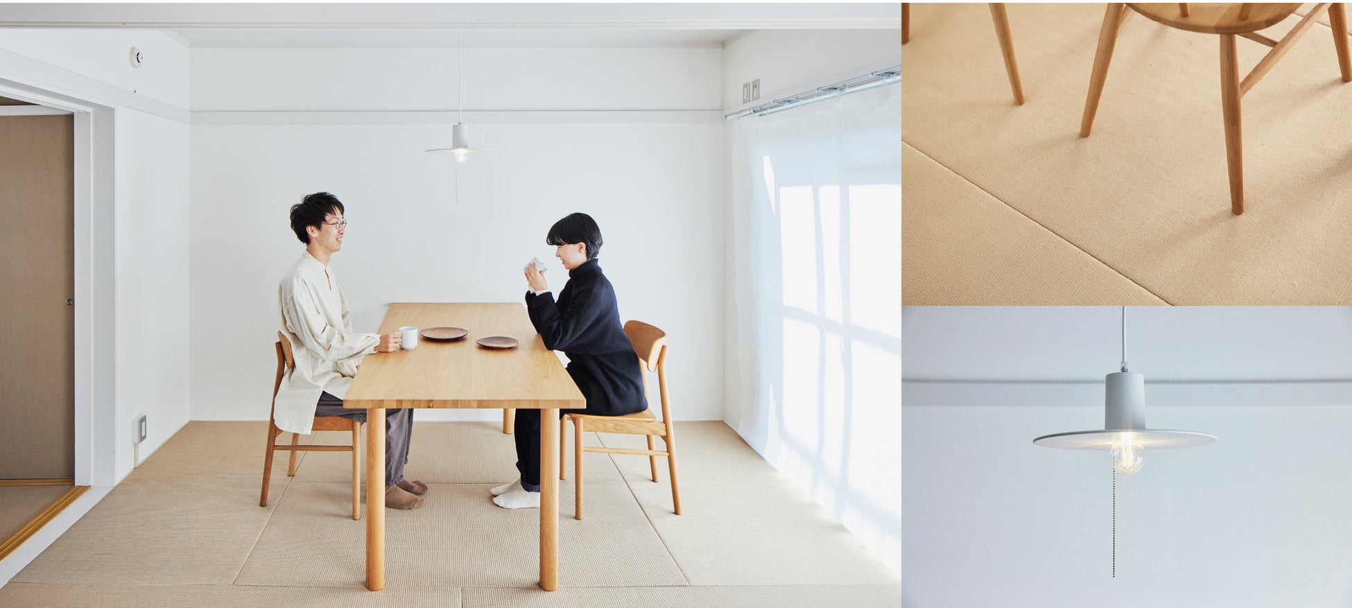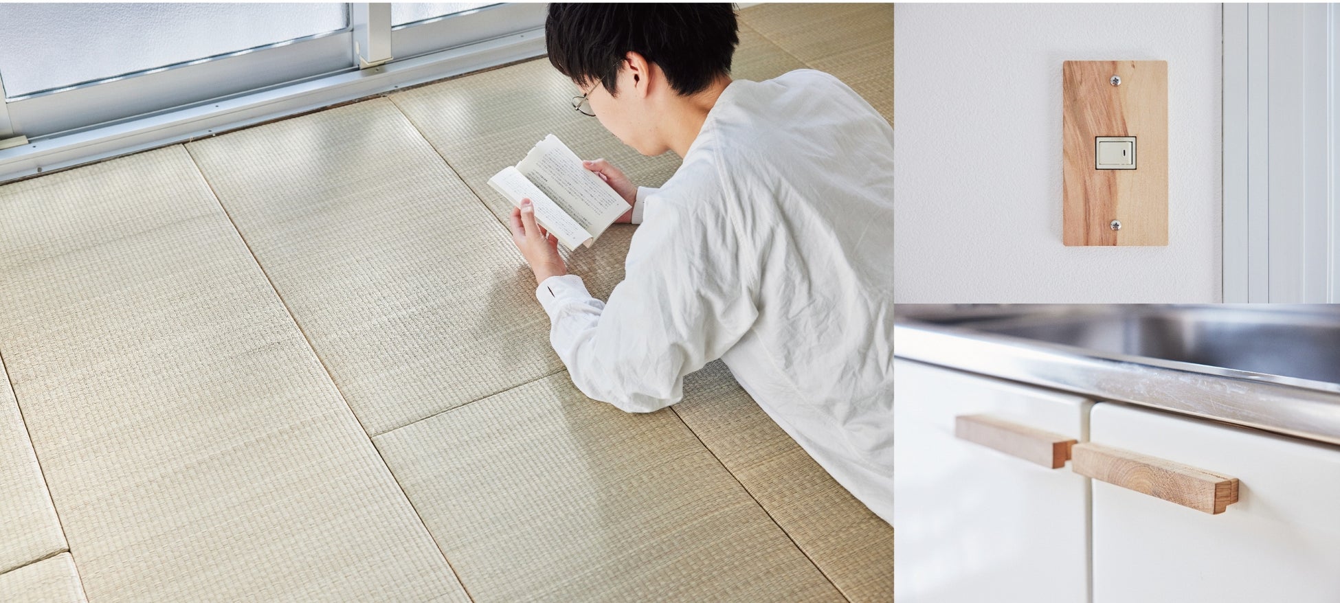 普段は処分されてしまう短いい草を利用した1/2サイズのい草畳と、団地の伐採木などでできた木製取手・スイッチプレートといった素材を大切に活かし、新たな価値を与えてできたパーツによって、サステナブルな暮らしを体感できます。