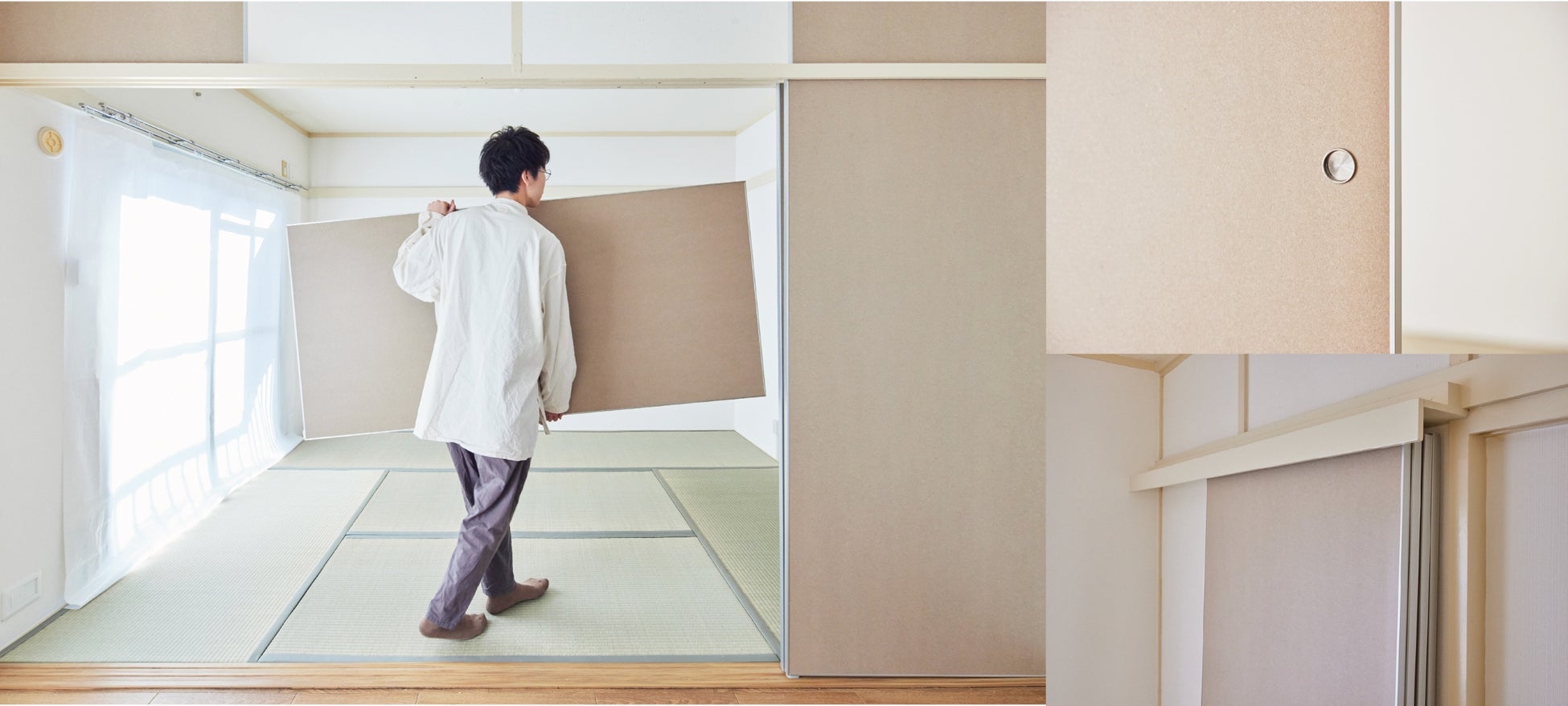 ダンボール、半透明ふすまとふすま収納を組み合わせました。ふすまを外すことで、部屋を暮らし方に合わせた間取りにすることができます。外したふすまは「ふすま収納」に収納することができ、お部屋の中で邪魔になることがありません。