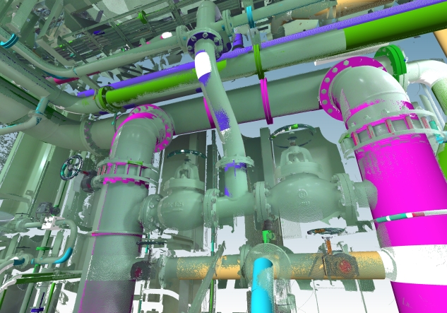 ・壁に遮られ採寸困難な建物の配管メンテナンス工事において、3Dで両側のデータを測定し、合成、正確に採寸。