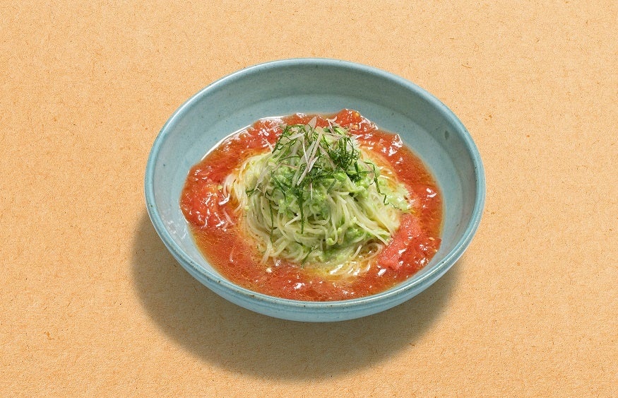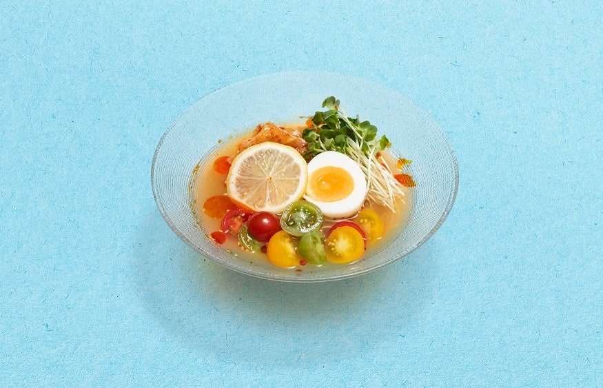 レモングラス香る木姜油使用の華やかな香りのスープはリンゴ酢でまろやかな酸味を楽しめる冷麺。食欲増進効果のザーサイと、夏野菜の主役のカラフルトマトでさっぱりと栄養補給を。ひんやり涼しく、暑い夏にぴったりの一品。