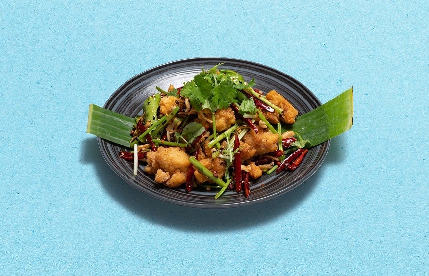 コリアンダーやクミン、ハーブでマリネした鶏肉の唐揚げを沢山の唐辛子や花椒、パクチーと共に炒めたピリッと辛い夏にぴったりな一品!