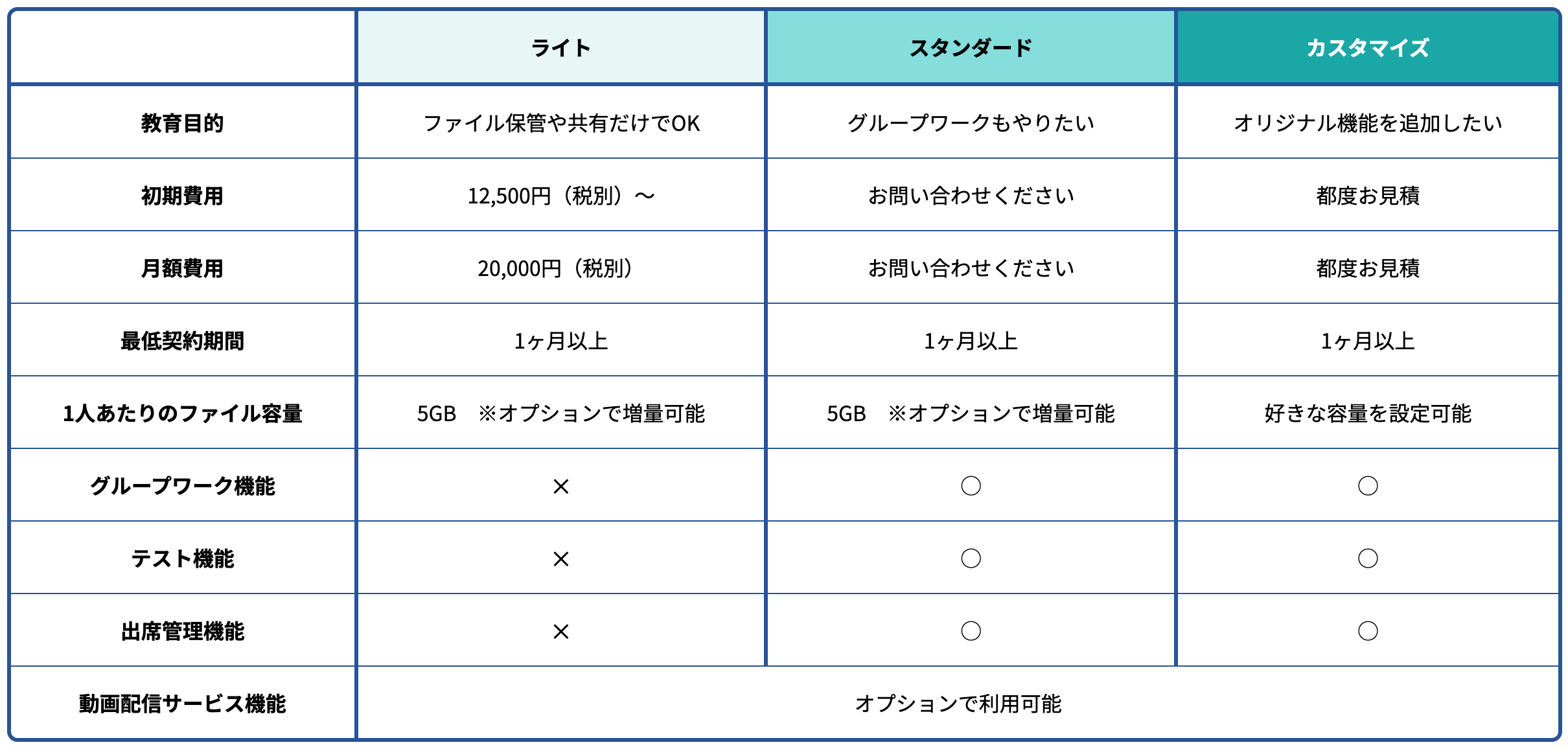 Phollyでは、シンプルな機能で手軽に始められる「ライトプラン」、グループワークやテスト機能などが充実している「スタンダードプラン」、オリジナル機能を追加できる「カスタマイズプラン」の3プランをご用意しており、全てのプランで学認をご利用いただけます。