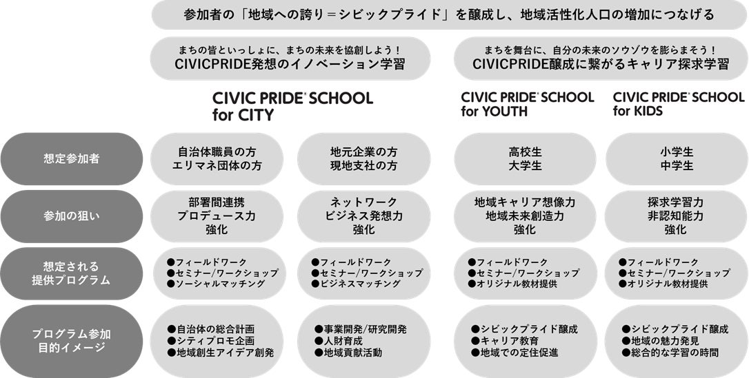 本サービスは、これまでの都市生活研究所における「シビックプライド / CIVIC PRIDE®」の研究知見を活かし、それぞれの地域で事業者や教育機関に向けたスクールプログラムを設計、実施することで未来を一緒に創る人を育てる研修サービスです。参加者や目的に合わせ、CIVIC PRIDE発想のイノベーション学習や、CIVIC PRIDE醸成に繋がるキャリア探求学習を基本に、地域や課題に合わせたオリジナルプログラムを関係者と共に開発します。