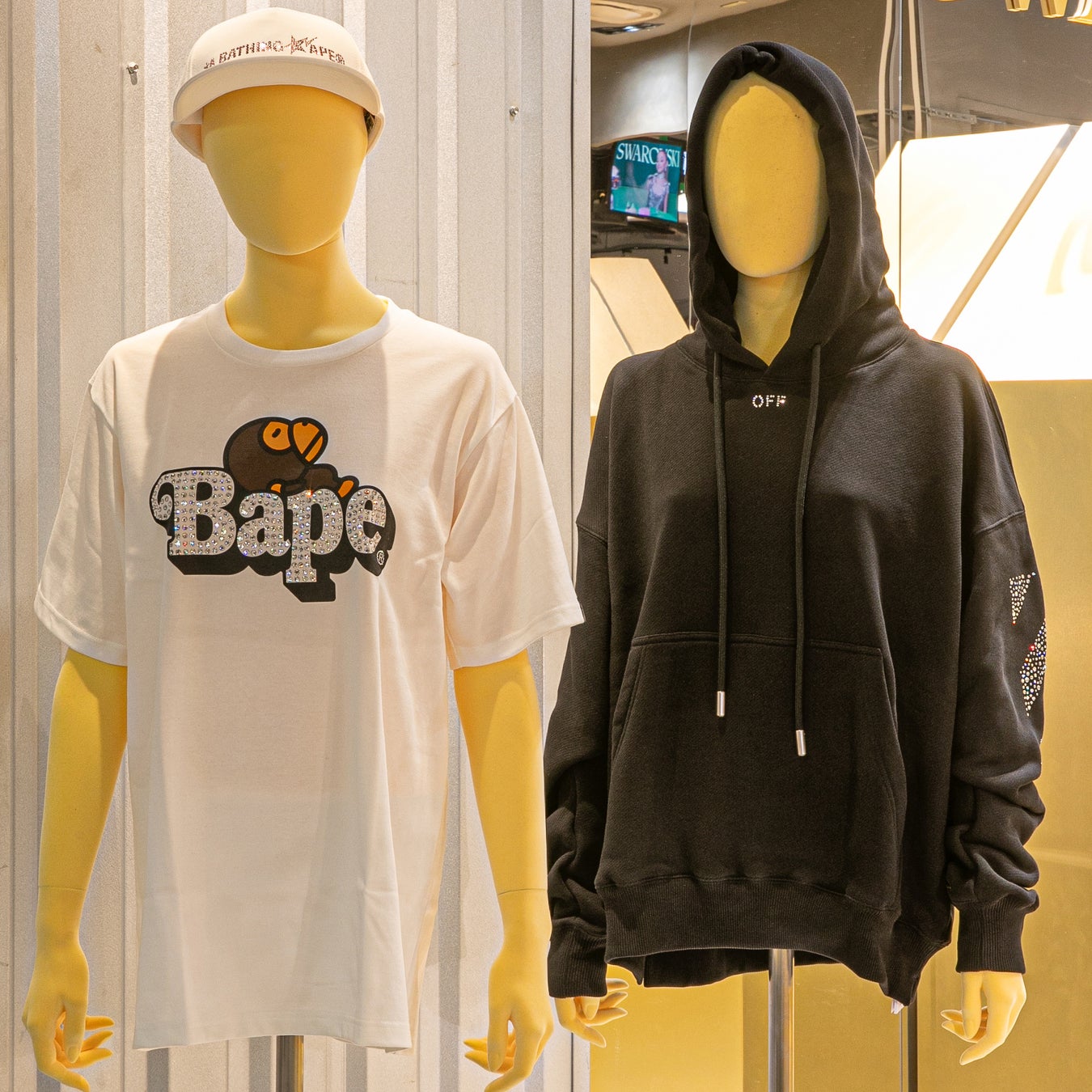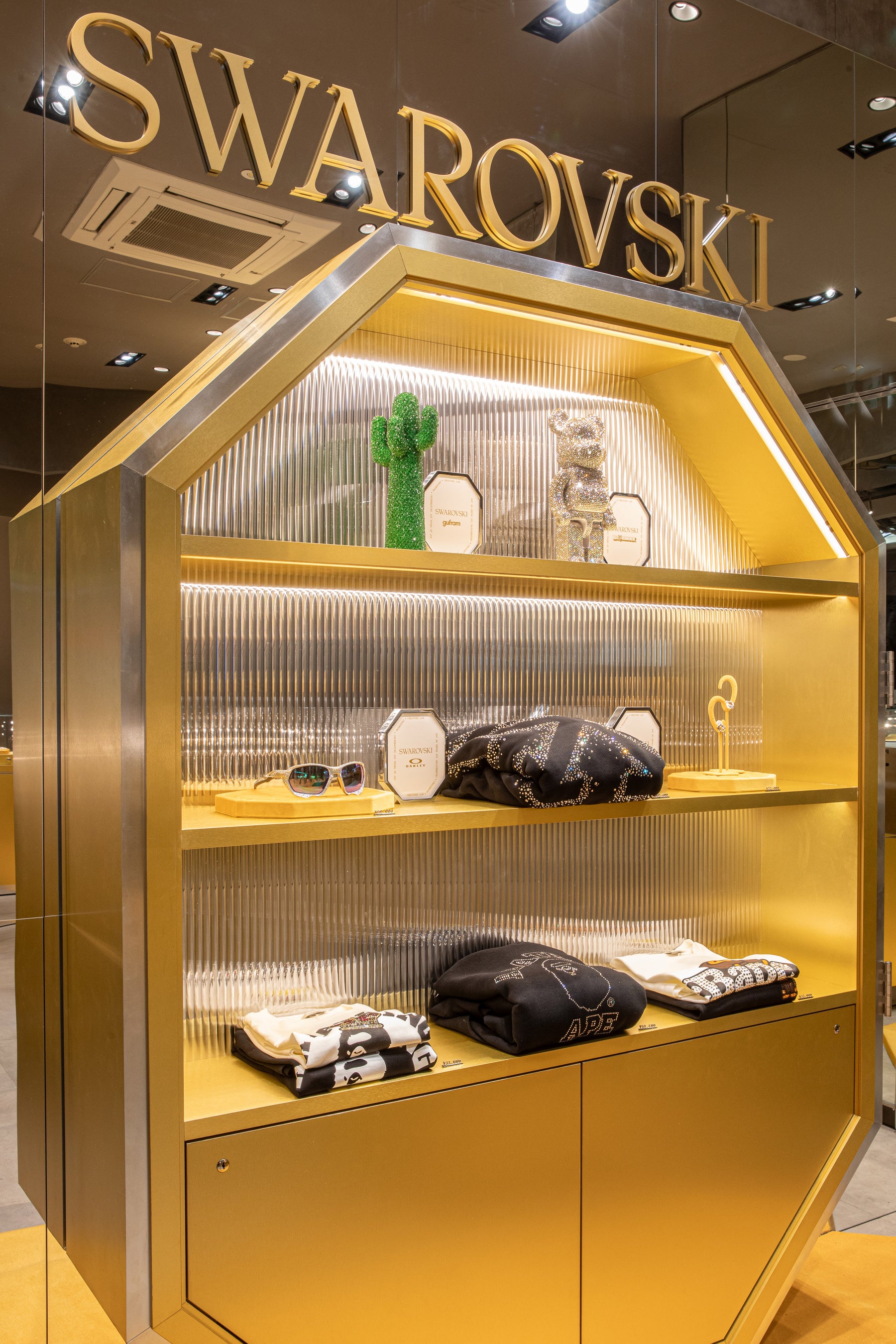店内にはジュエリー、ウォッチ、オブジェ、アクセサリーの他、Swarovski Creators Labから、130周年を記念して発表されたコラボレーションの特別な商品も並びます。2021年に始動したSwarovski Creators Labは、創造性を解き放つためのプラットフォームとして誕生し、クリスタルの変革力によって多様なオブジェクトを再解釈する場となっています。14,500粒のクリスタルをまとい、ポップカルチャーの象徴をクリスタルアートの傑作へと昇華したBE@RBRICKや、11,388粒のSwarovskiクリスタルでラグジュアリーに進化したA BATHING APE®のシグネチャーであるバーシティジャケット、ラグジュアリーファッションとストリートウェアの交差点に立つOff-White™の4,025粒のSwarovskiクリスタルで星空を思わせるデザインへ変貌をとげたアイコニックなフーディなど、クリスタルのサヴォアフェールとポップラグジュアリーが融合した逸品が揃います。