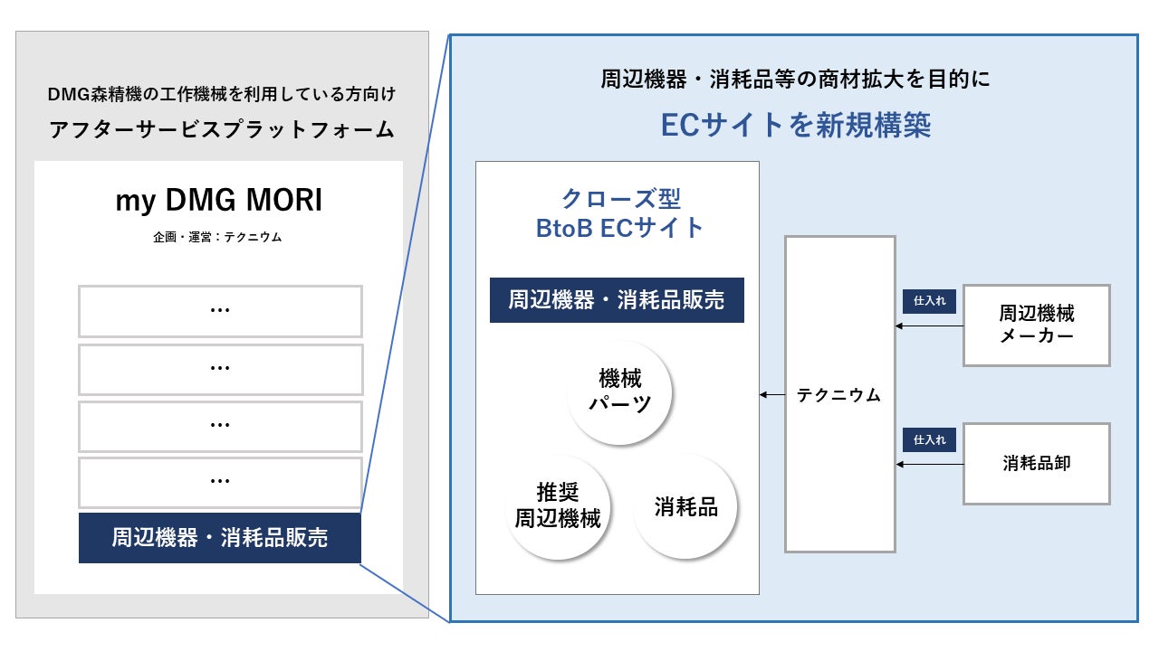 今回、機械のライフサイクルにおいてお客様がより便利にお使いいただくためのトータルソリューションを提供する一環として、DMQP品※2を中心とした周辺機器や工場内で使用する様々な消耗品など、様々な商品を掲載し、外部メーカー、消耗品の卸売業者などから商品を仕入れ、販売する形のクローズ型BtoB ECサイト構築を目指します。