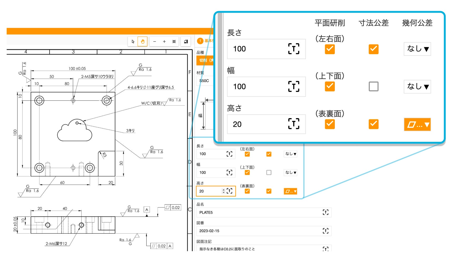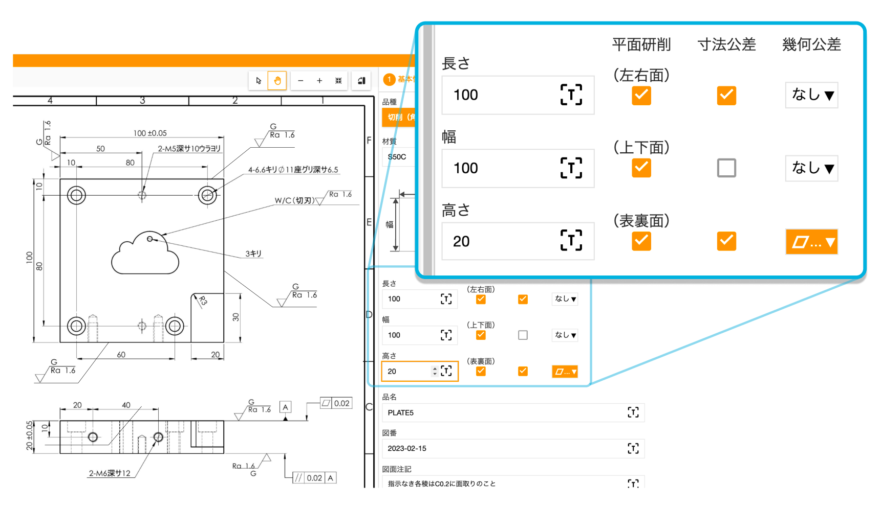 今回の機能拡大では、高さ(表裏面)方向だけでなく、長さ(左右面)・幅(上下面)方向にも対応し、チェックボックスにチェックを入れるだけで簡単に平面研削を設定できるようになりました。また、研削指示がある場合に多い「寸法公差」や「幾何公差」も同時に指定いただけます。