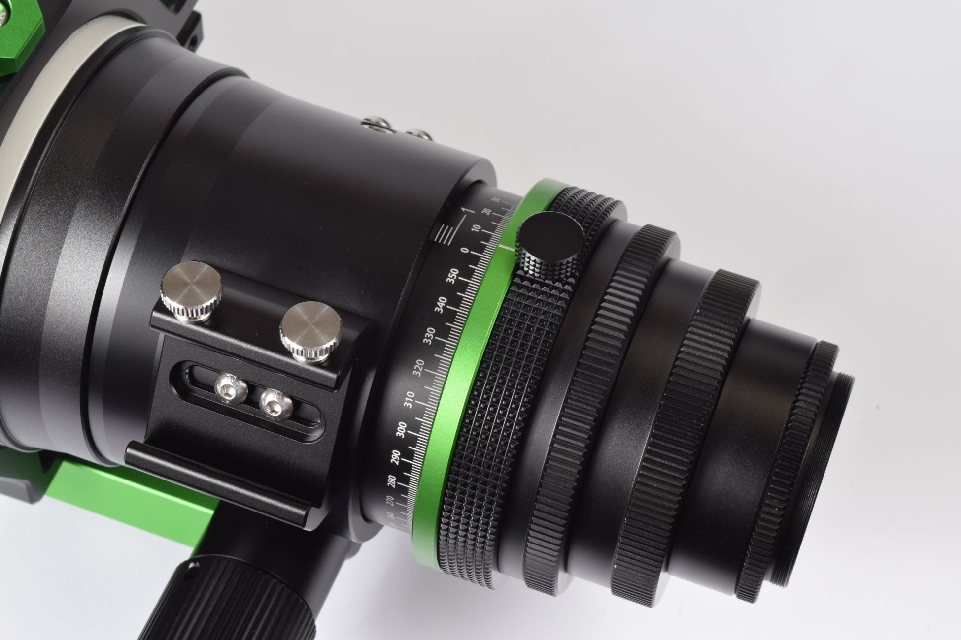 ・約100mmの長い繰り出し長を持つドローチューブには、繰り出し長を示す目盛と、カメラ回転装置の回転角度を示すメモリが備わっています。ピント位置の管理、また撮影時の構図決めの際に大変便利です。