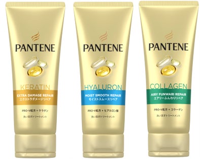 新しくなった新パンテーンは、悩みや理想のスタイルに合わせて、エクストラダメージリペア、モイストスムースリペア、エアリーふんわりリペア、の3種類のラインナップをご用意しました。各シリーズラインナップの全ての製品に、それぞれ、ケラチン*²、ヒアルロン酸*³、コラーゲン*⁴、のサロン成分を配合して、ダメージをしっかり補修します。シャンプー・コンディショナー・洗い流すトリートメント・洗い流さないトリートメントの4製品をシリーズ使いすることで、より効果的な仕上がりを実現し、理想の髪へ導きます。