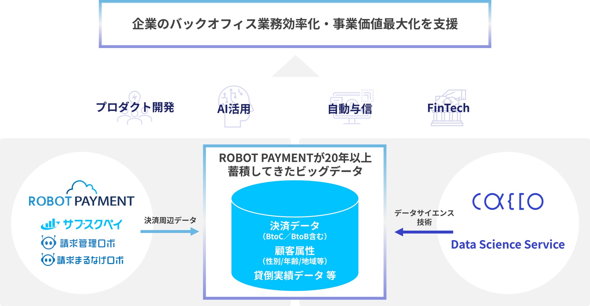 第1弾として、ROBOT PAYMENTのBtoC/BtoB合わせた決済データとかっこのデータ分析力を組み合わせ、「請求まるなげロボ」のもつ貸倒実績データを解析する取り組みを開始しております。貸倒率削減や与信通過率改善などの精度向上を行い、取り扱いの拡大、売上の増加を目指します。