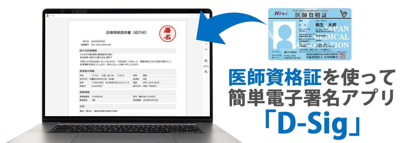 株式会社アイ・オー・データ機器(本社:石川県金沢市、代表取締役会長:細野 昭雄、以下、アイ・オー・データ)は、2025年10月1日、医療機関における診療情報提供書の電子的な送受信を支援する電子署名アプリケーション「D-Sig(ディーシグ)」を発表いたします。