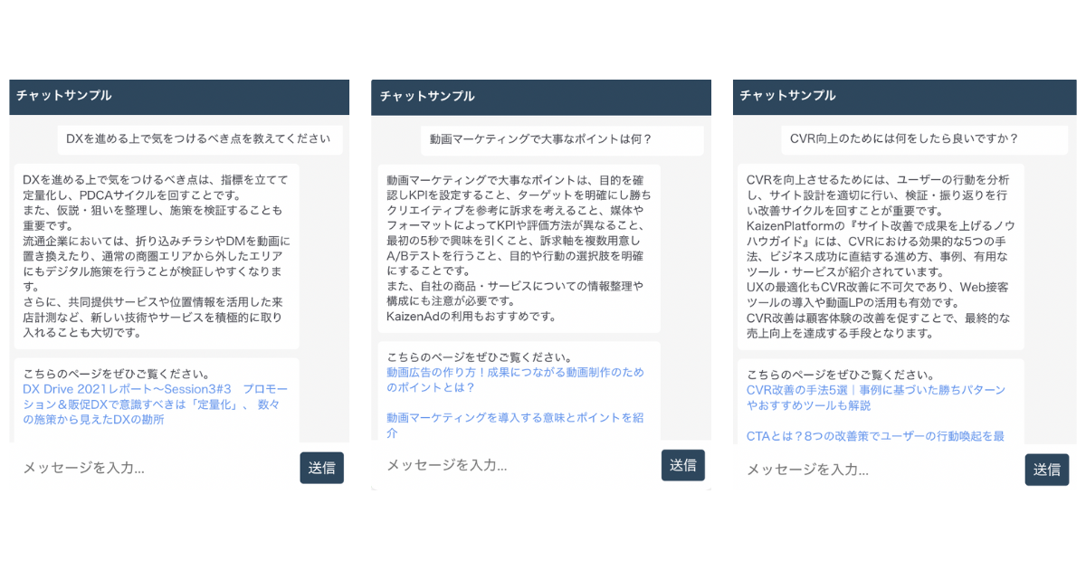 そこでKaizen Platformは、Webサイトにタグ(JavaScriptのタグ)を設置するだけで、誰でも簡単にパーソナライズやABテスト等のUI/UX改善施策の実装が可能となるUXソリューションの開発基盤「KAIZEN ENGINE」をアップデートし、GPT-3.5やGPT-4など生成AIのAPIを活用したAI機能実装を可能にするオプションサービスの提供を開始します。本オプションサービスを活用することで、大規模な改修をすることなく簡単にWebサイトへ生成AIを活用したチャットボットや検索機能の実装が可能となります。