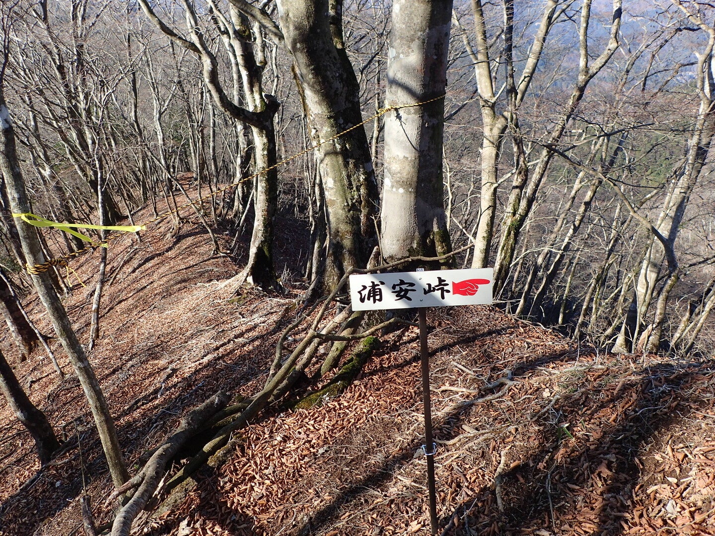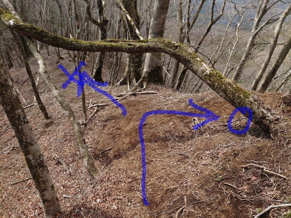 神奈川県と山梨県の県境に位置する、西丹沢の大界木山〜浦安峠です。尾根づたいに道がありますが、「右」に曲がるルートが正しい登山道です。