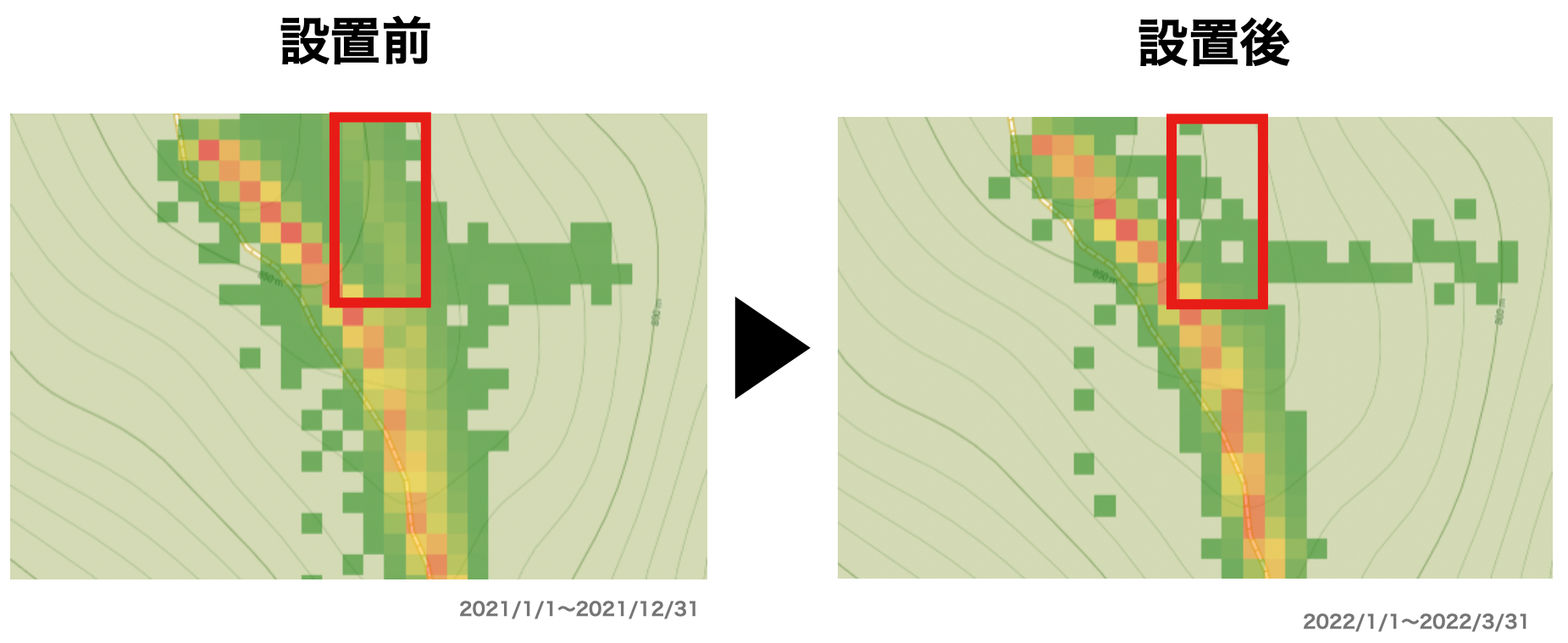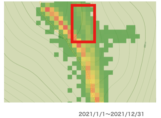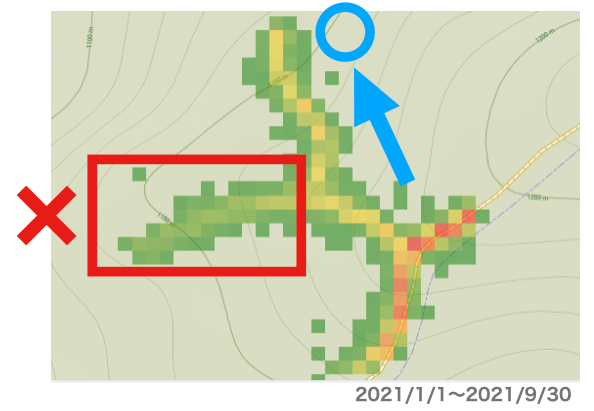 通った人の数を色で識別するデータでは、かなりの人が道を間違えています。【緑:人数が少ない、赤:多い】