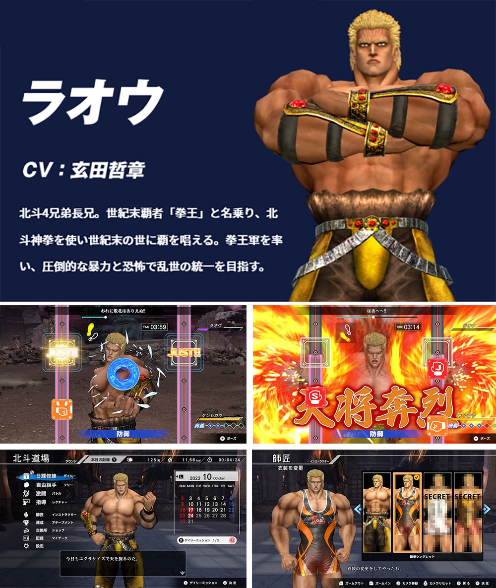 また、「ボスバトル」でラオウを倒すと、“師匠 インストラクター”として使用することが可能になります。「容赦せぬぞ!」「次こそ、うぬの本気を見せてみろ」「心地よきエクササイズというべきか!」などの“拳王”の叱咤激励を受けながら、日々のエクササイズをお楽しみください。本作でしか見られないラオウの衣装も必見です。