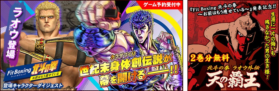 「Fit Boxing 北斗の拳」発売発表を記念して、出版社公式マンガアプリ「マンガほっと」にて、原作「北斗の拳」から「Fit Boxing 北斗の拳」に登場するキャラクターのエピソードを集めたダイジェスト作品を公開しています。本日10月27日より、ダイジェスト作品へのラオウのエピソード追加と、あわせて「天の覇王 北斗の拳ラオウ外伝」2巻分が無料で読める、試し読み増量キャンペーンを実施します。