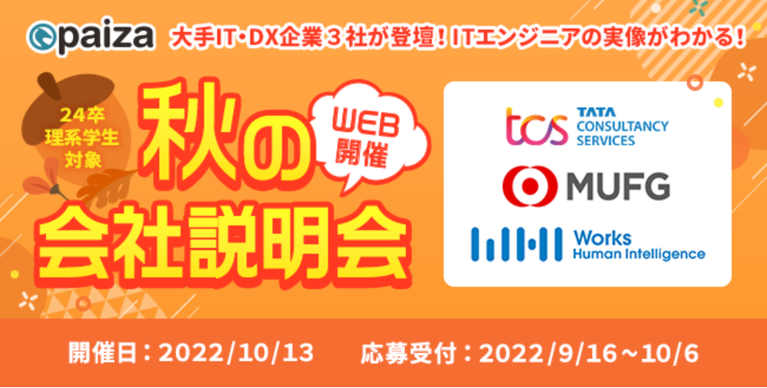 ITエンジニア向け国内最大の転職・就職・学習プラットフォーム「paiza(パイザ)」(paiza株式会社 東京都港区、代表取締役社長 片山良平)は、ITエンジニア職専門の就職活動情報サイト「paiza新卒」にて、2022年10月13日(木)に24年卒理系学生向けに大手IT・DX企業3社のITエンジニアが登壇するオンライン合同会社説明会を実施します。本日よりエントリー受付を開始いたします。